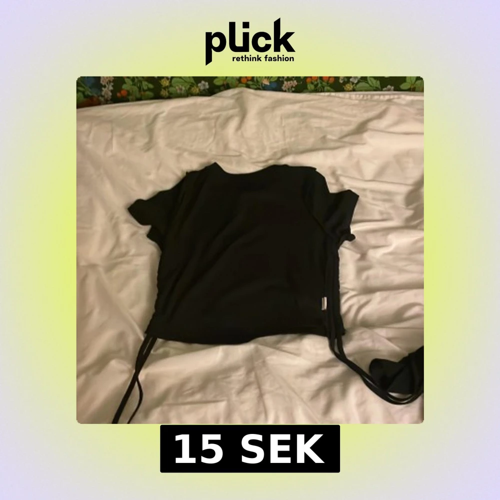 Säljer en svart topp från Shein med korta ärmar och knytband i sidorna. Perfekt för en stilren look. Toppen är tillverkad i ett mjukt material som känns skönt mot huden.