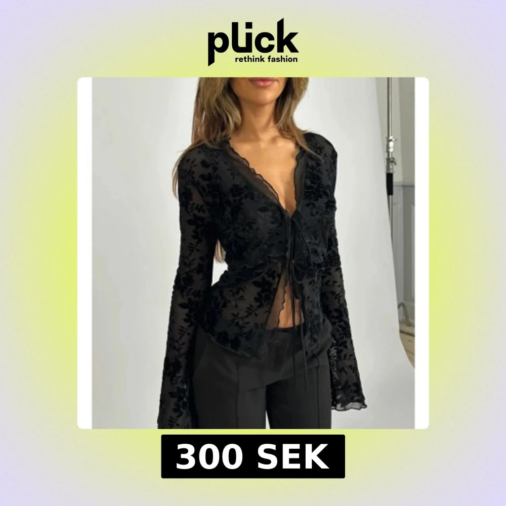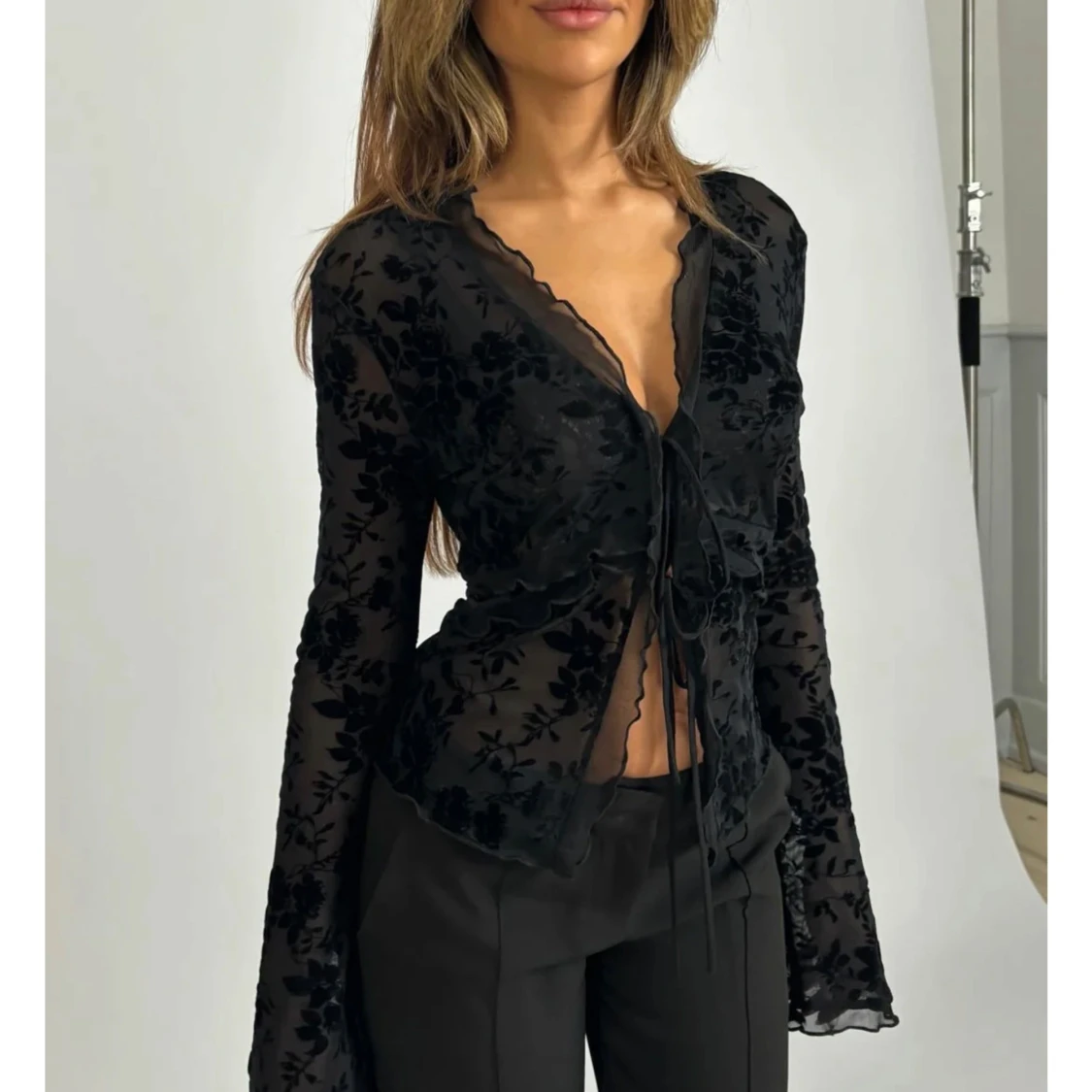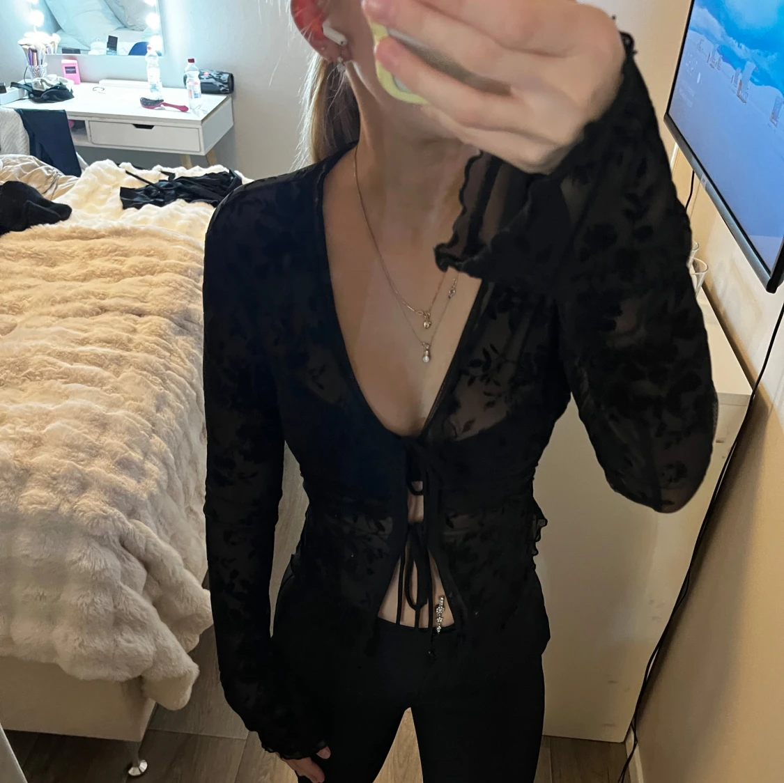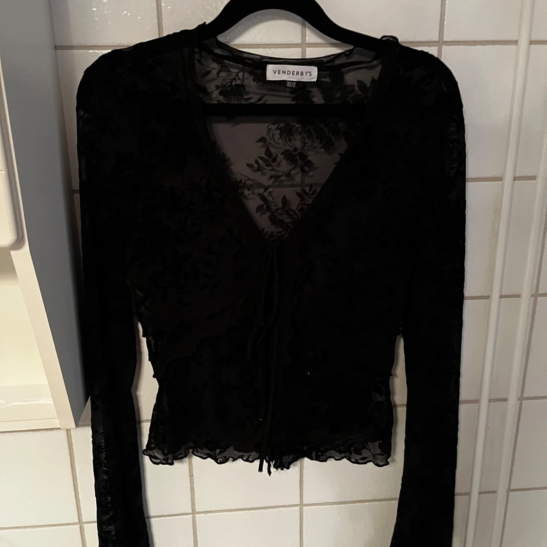 Säljer en svart transparent blus från Venderbys med blommigt mönster i sammet. Använd endast 1 gång så den är i jätte fint skick😍
