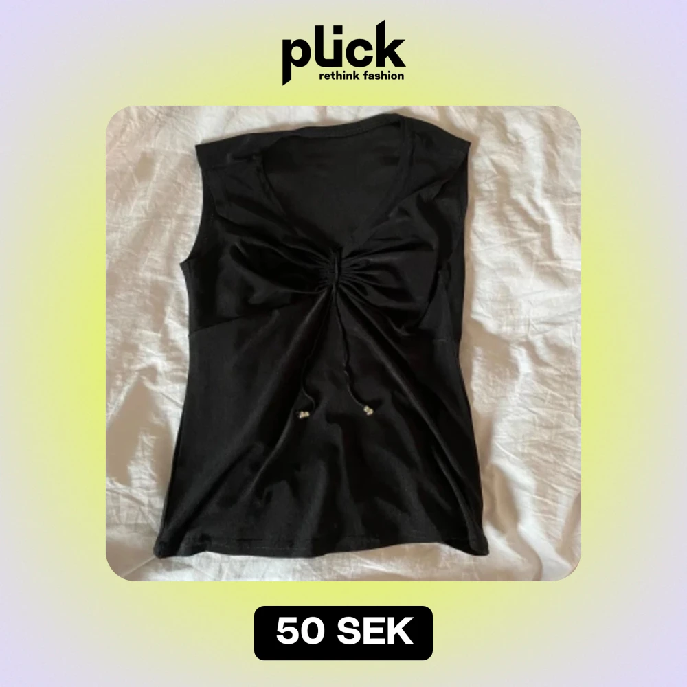 Svart topp med drag-detalj. Blir en scrunch där fram som man kan justera med banden. Super skönt material!