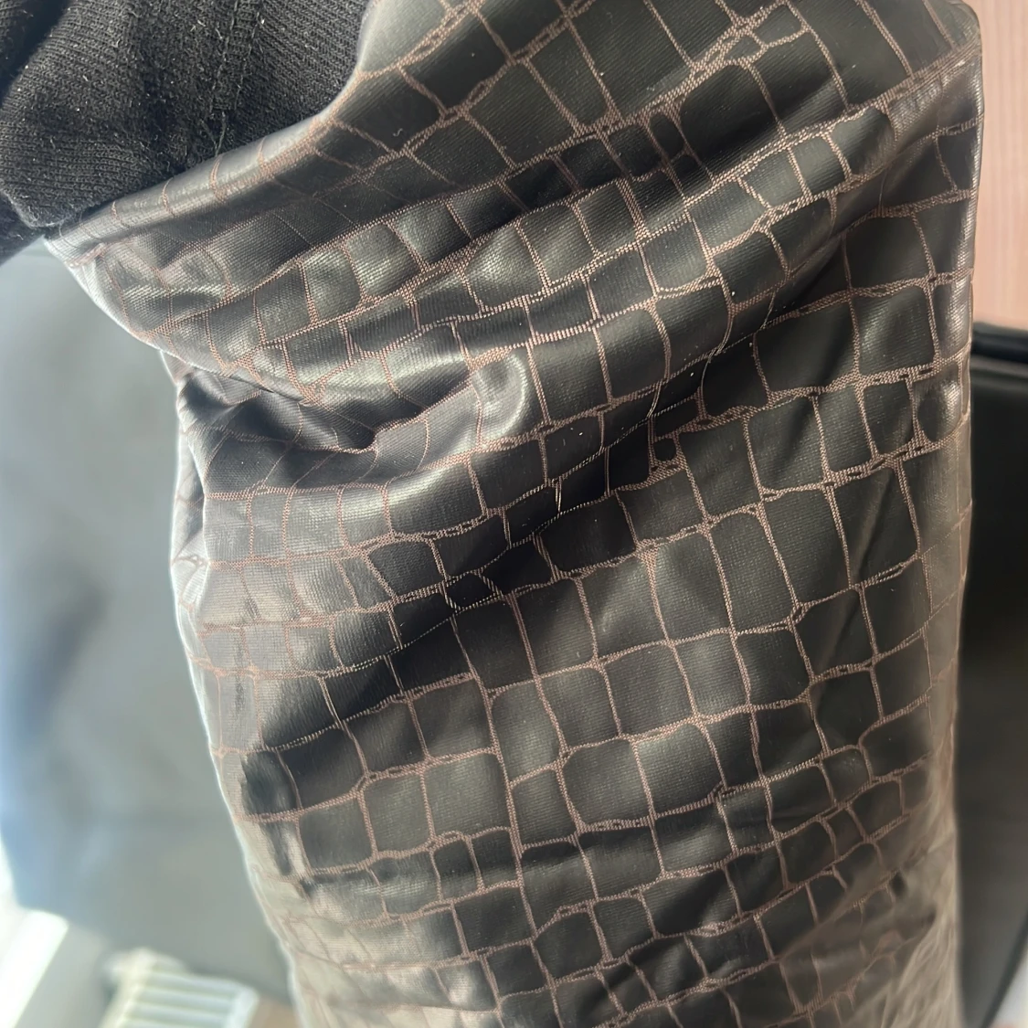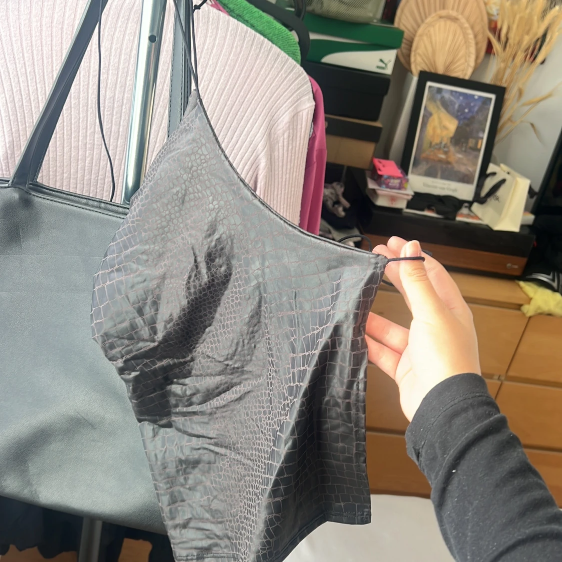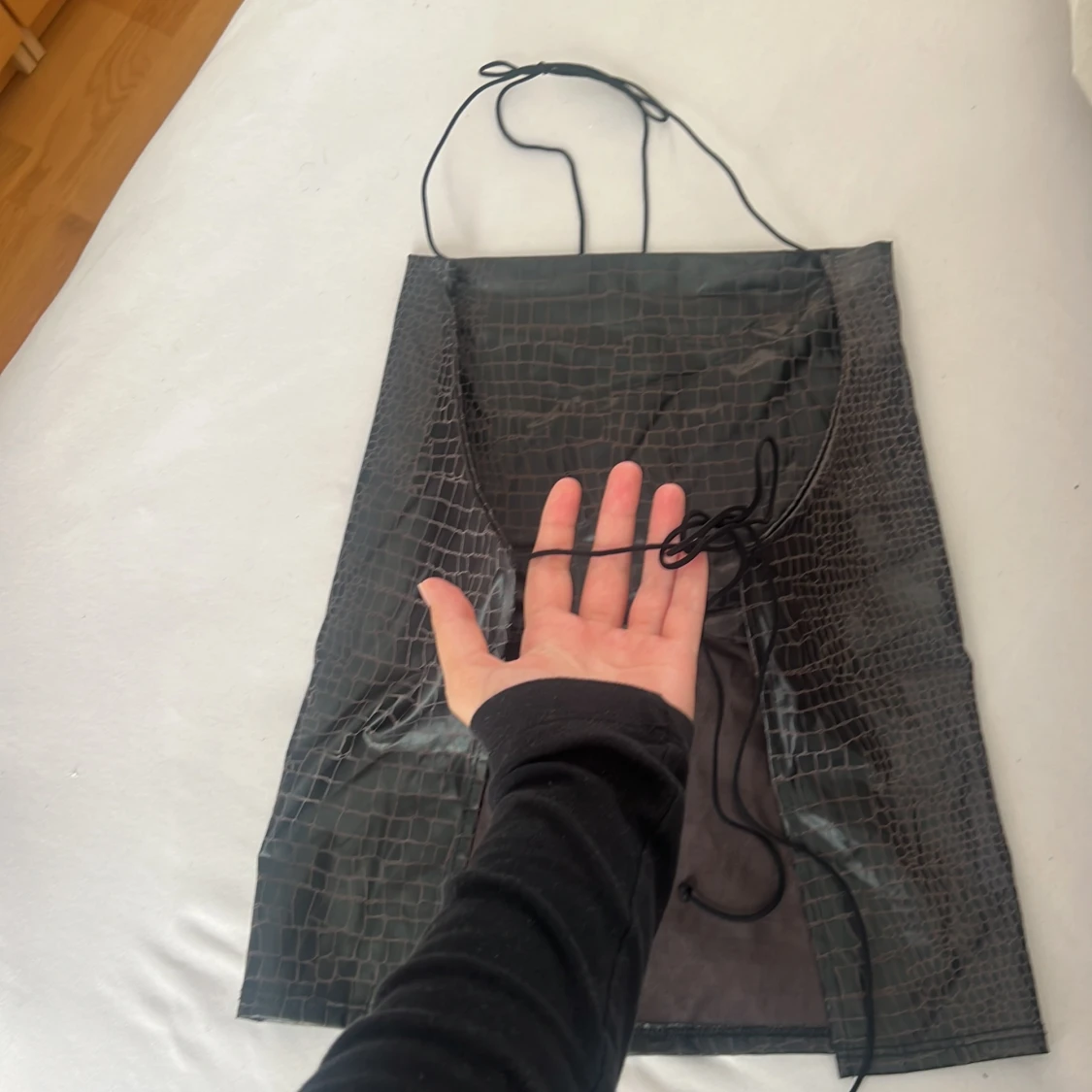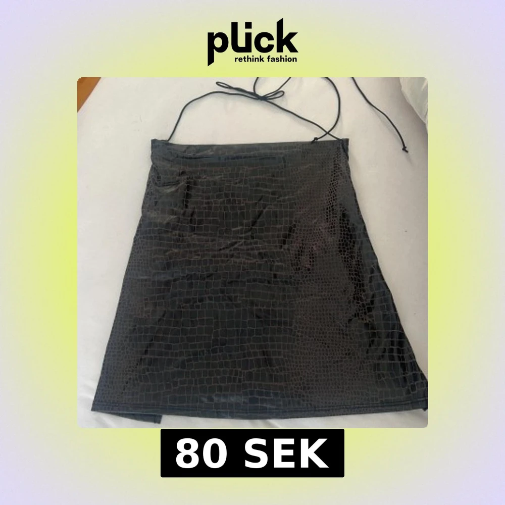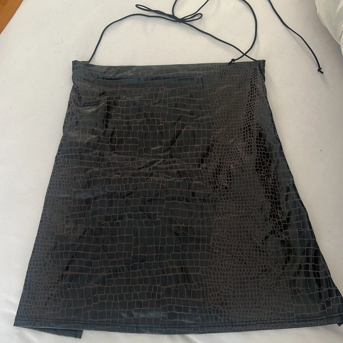 Snygg svart topp med crocoinspirerat mönster och tunna axelband som knyts i nacken. Klänningen har en slät, glansig yta och är figurnära med minimalistisk design. Perfekt för dig som gillar trendiga detaljer och vill sticka ut.