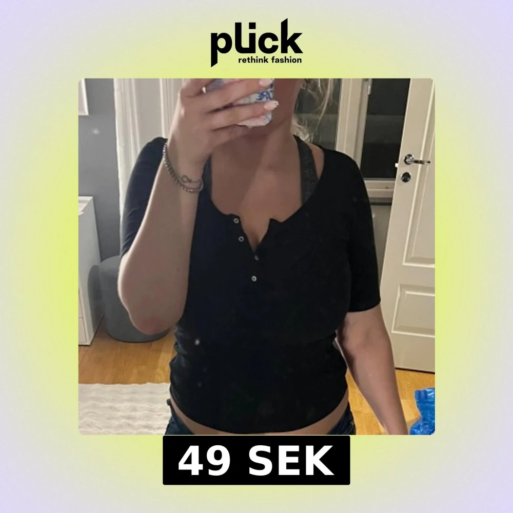 Svart topp från H&M med korta ärmar och djup v-ringning. Toppen har tre små knappar framtill och är figurnära i modellen. Perfekt att matcha med jeans eller kjol för en clean och enkel look.