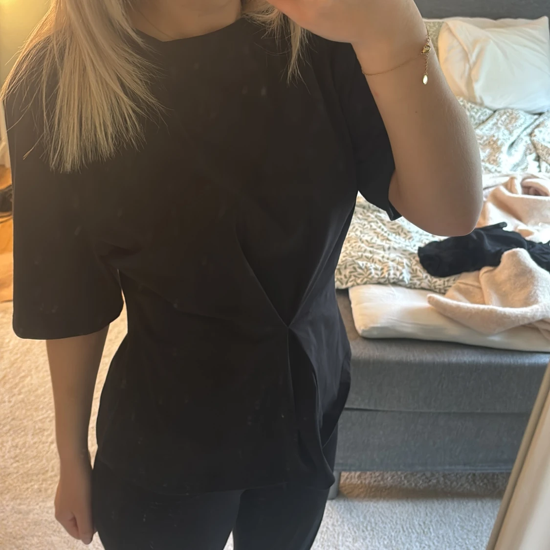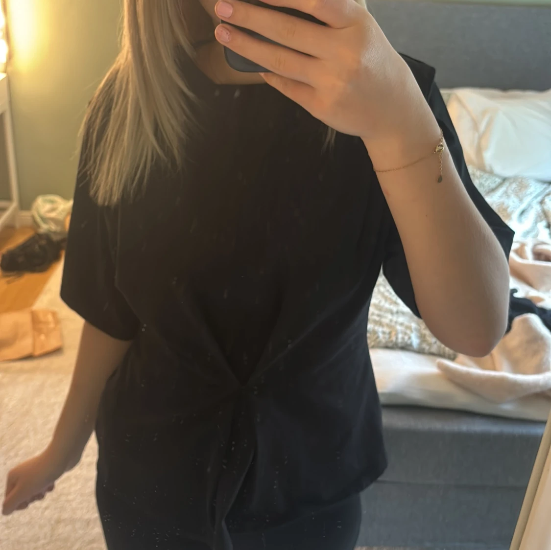 Säljer en svart topp med korta ärmar och snygg knutdetalj framtill som ger en cool twist. Toppen har rund halsringning och är i en rak, lite loose passform. Perfekt att styla med jeans eller kjol för en enkel men trendig look.
