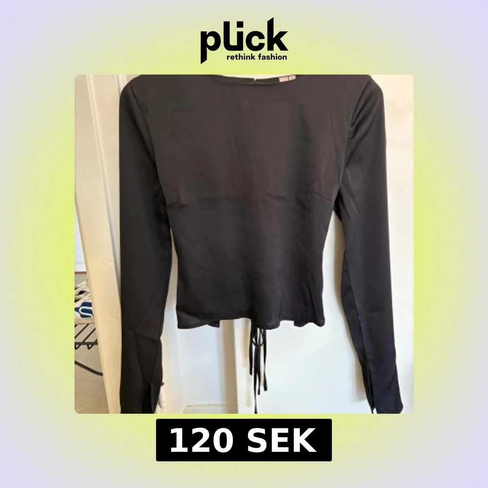 Svart satin topp med öppen rygg! En ”krok” har lossnat på enda sidan där bak, men inget som syns när man har på sig den eller när det är knäppt (se bild på baksidan). Endast använd en gång!