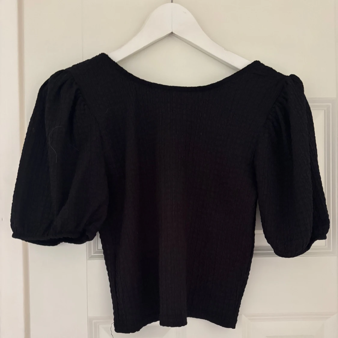 En svart topp med snygga puffärmar och rund halsringning. Tyget är lätt ribbat och ger en cool struktur. Perfekt för dig som gillar en stilren men trendig look. Passformen är normal och toppen är lite croppad.
