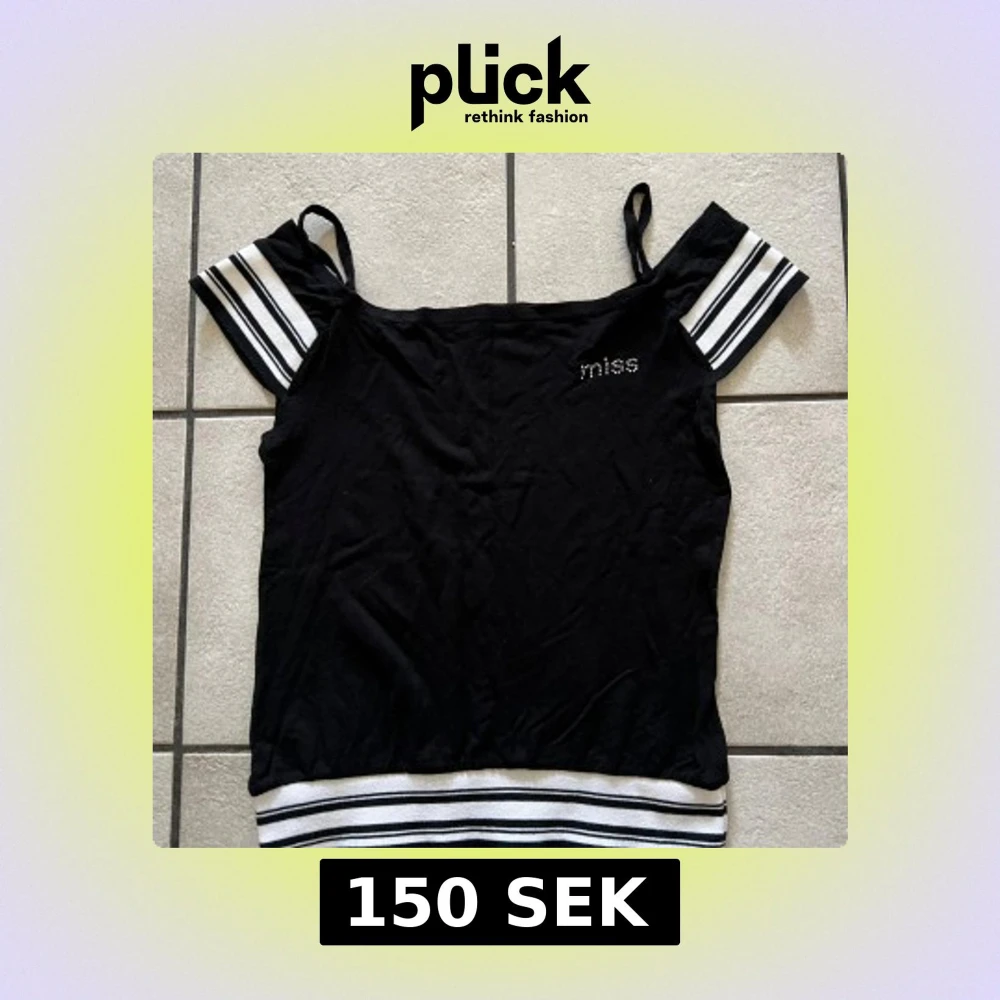Snygg svart topp med smala axelband och randiga detaljer i vitt och svart på ärmarna och nederkanten. Ordet 'miss' är dekorerat med små stenar på bröstet. Perfekt för en trendig look!