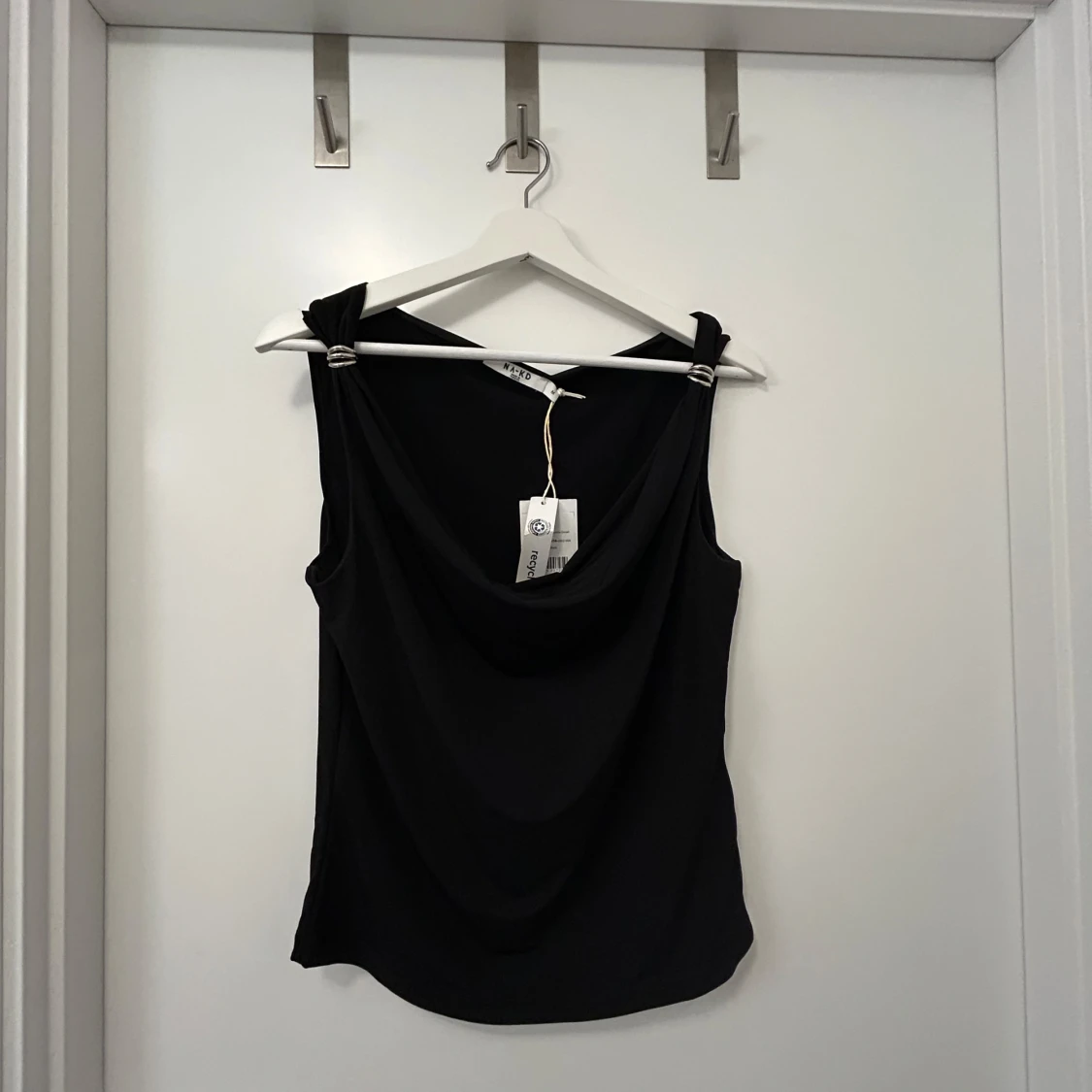Helt oanvänd topp från Na-kd med prislapp kvar. Går att bära på olika sätt som visat på bilderna. Svart med silver detaljer på axlarna. Storlek medium. Jättefin fest/middagstopp!💞