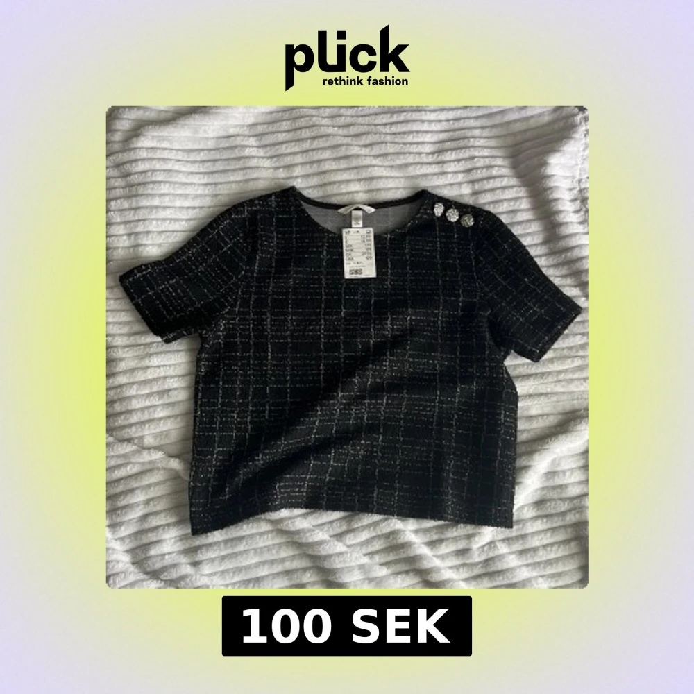 Säljer en svart topp från H&M med rutigt mönster i vit tråd. Toppen har korta ärmar och tre dekorativa silvriga knappar på ena axeln. Materialet är strukturerat och ger en exklusiv känsla. Inte använd. ✨
