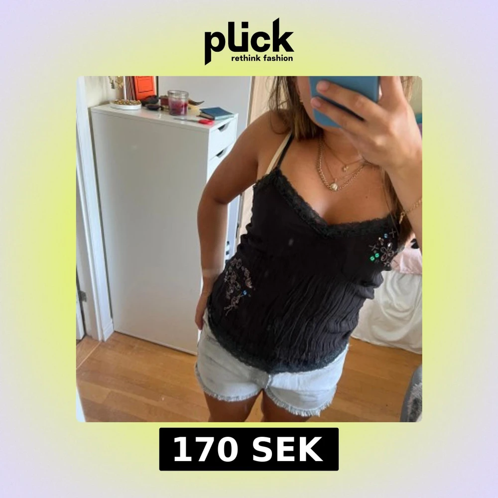 Topp med tunna axelband, spetskant vid urringningen och nederkanten. Toppen har broderade blommor med paljettdetaljer i svart och grönt på framsidan.
