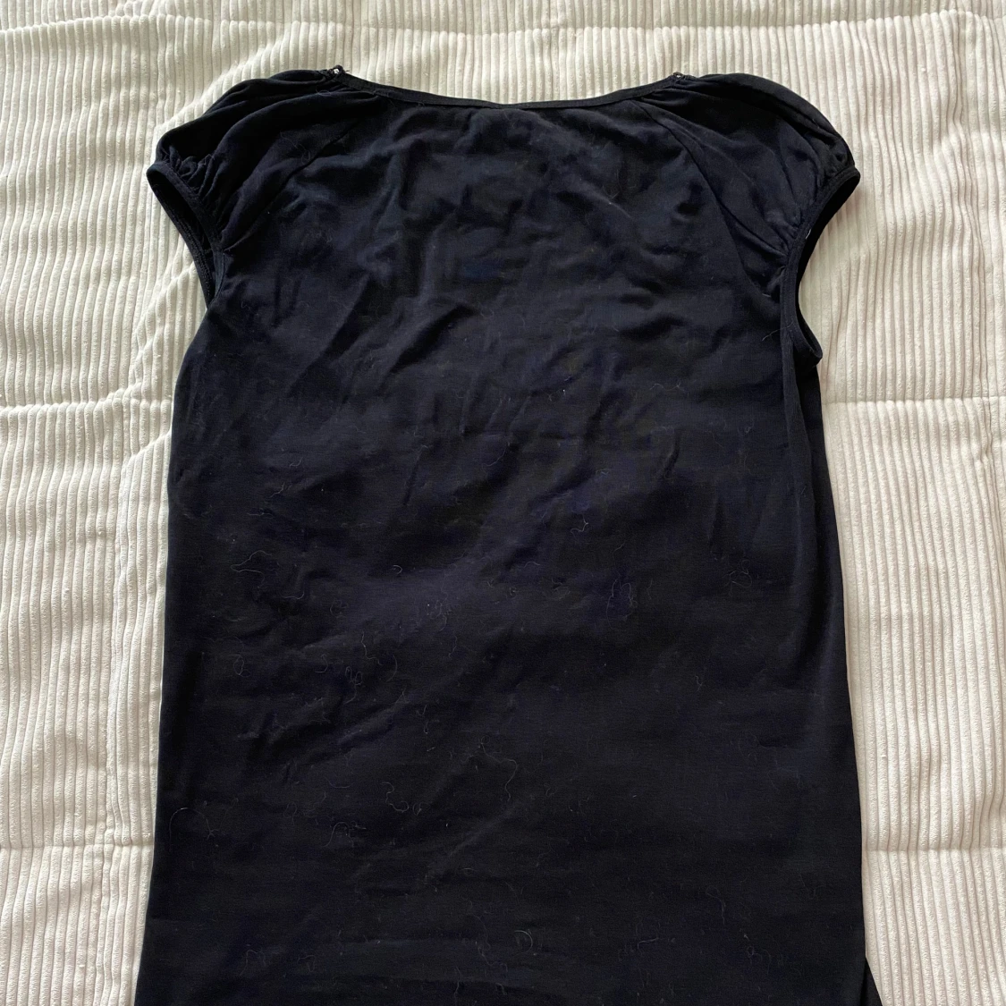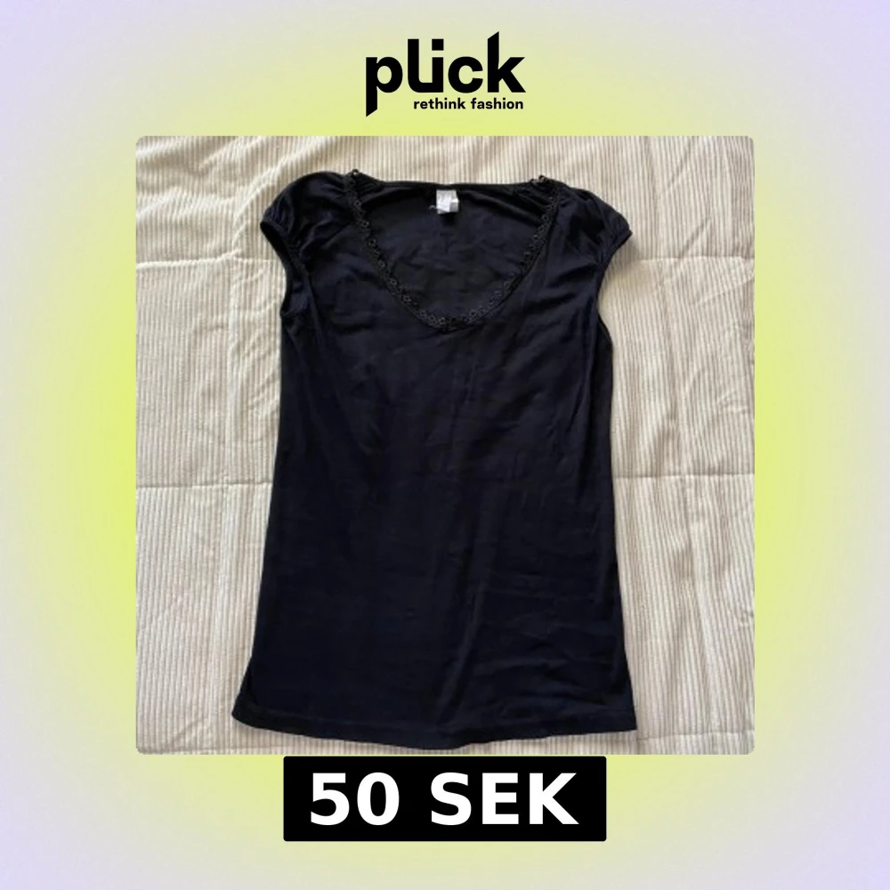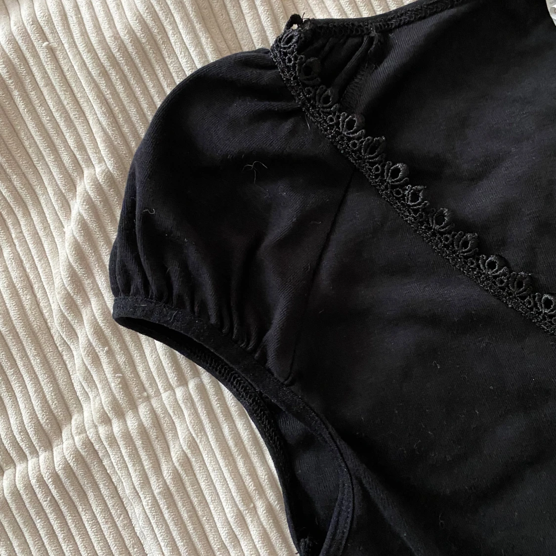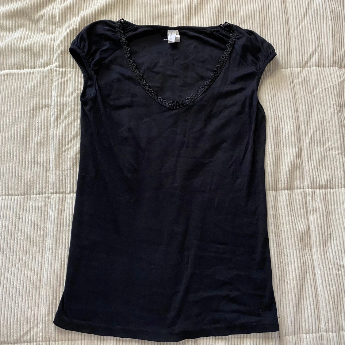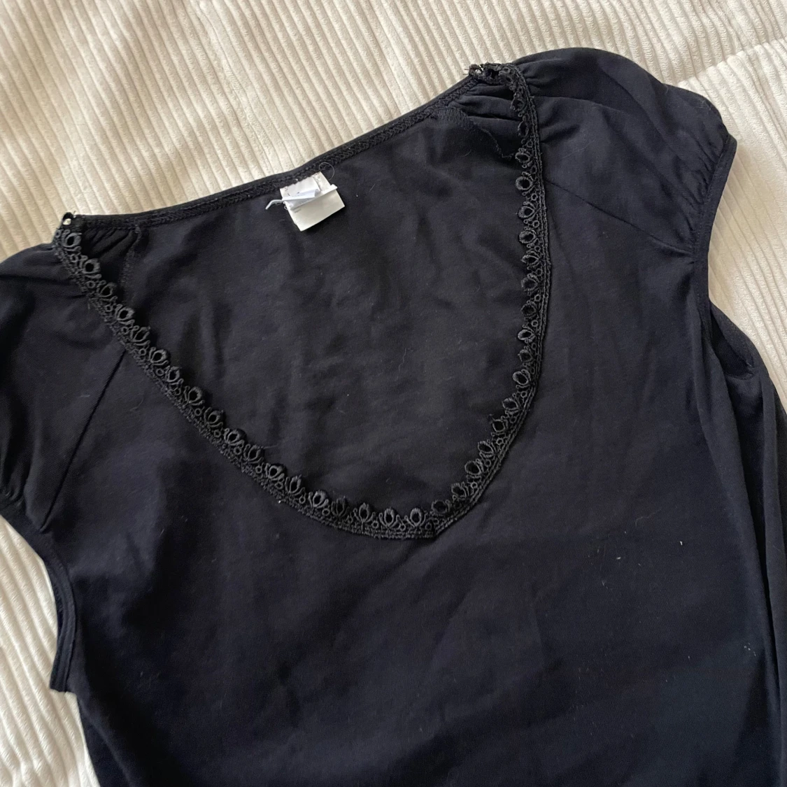 Säljer en svart topp med v-ringning och fina spetsdetaljer längs halsringningen. Toppen har korta ärmar och är gjord i ett mjukt material som känns skönt mot huden. Perfekt för en stilren look.