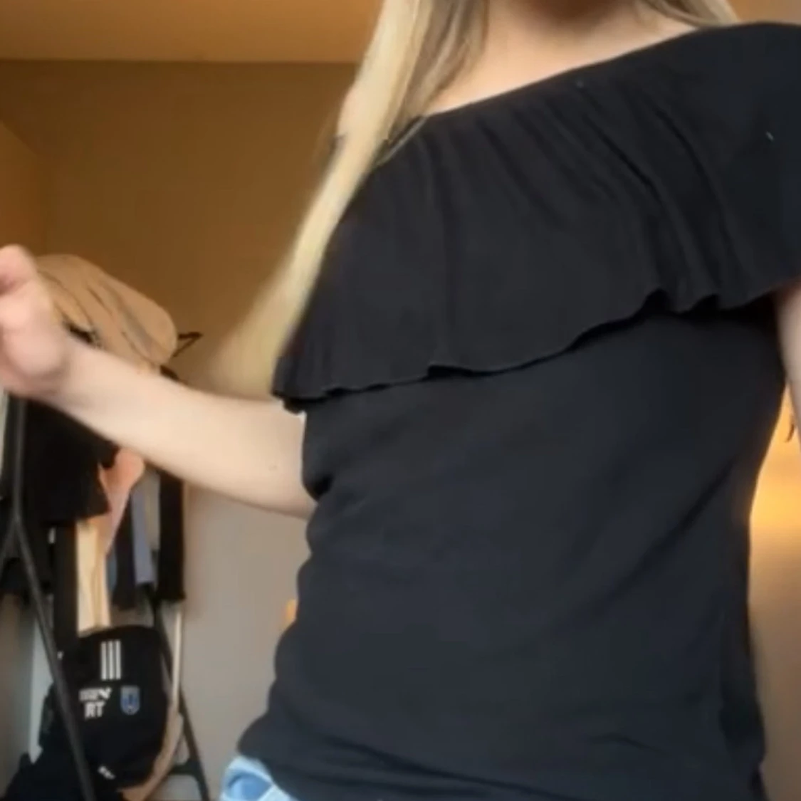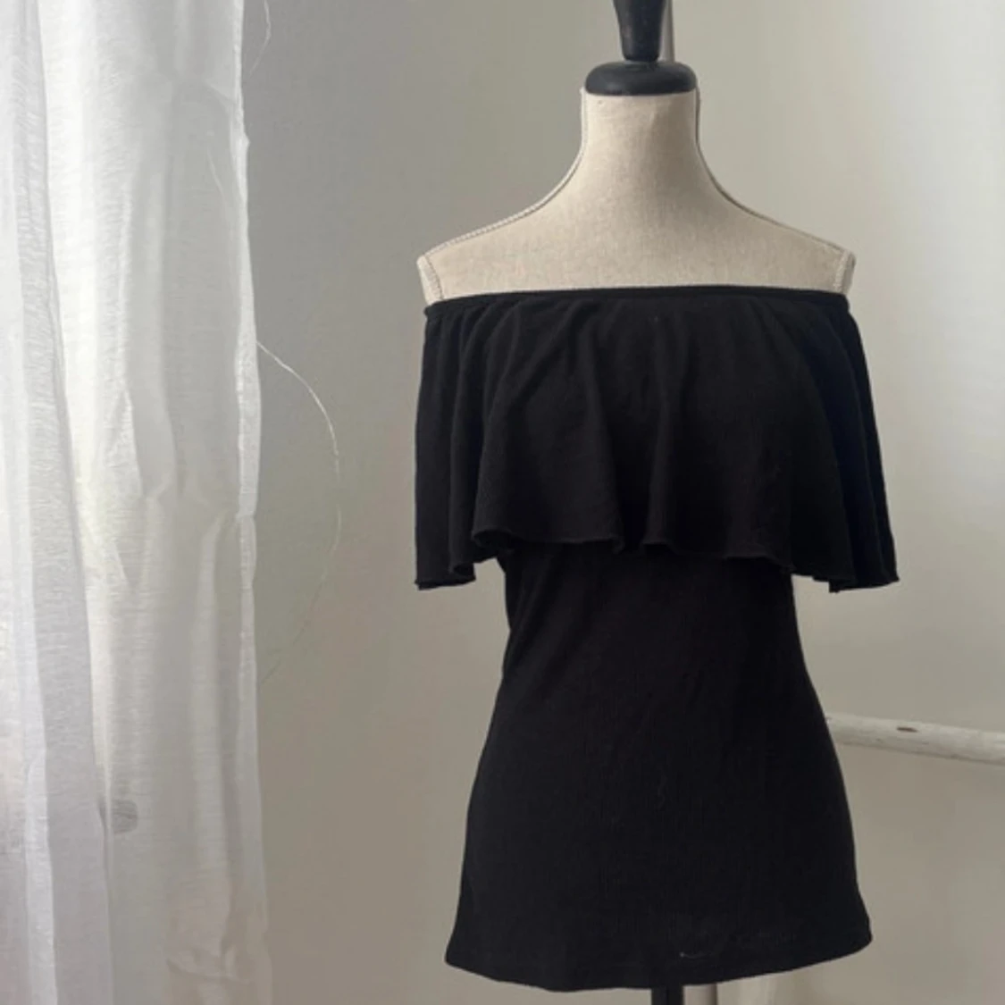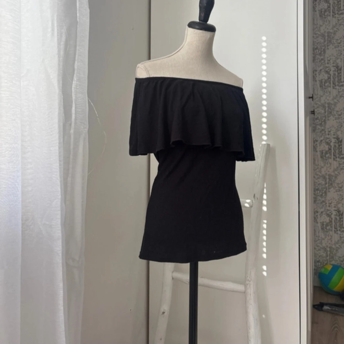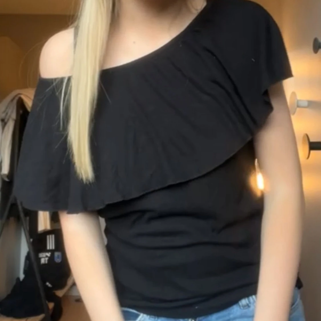 Supersnygg svart topp med volang! Perfekt till sommaren. Kan användas och stylas på olika sätt. Jätte fin och mjukt små ribbat material! Storlek xs men är bra till S.