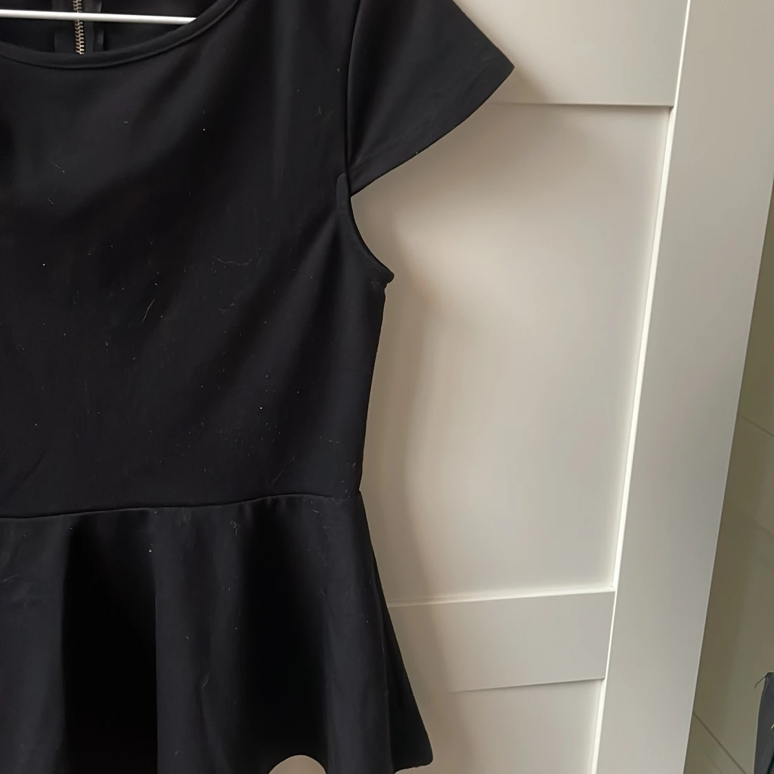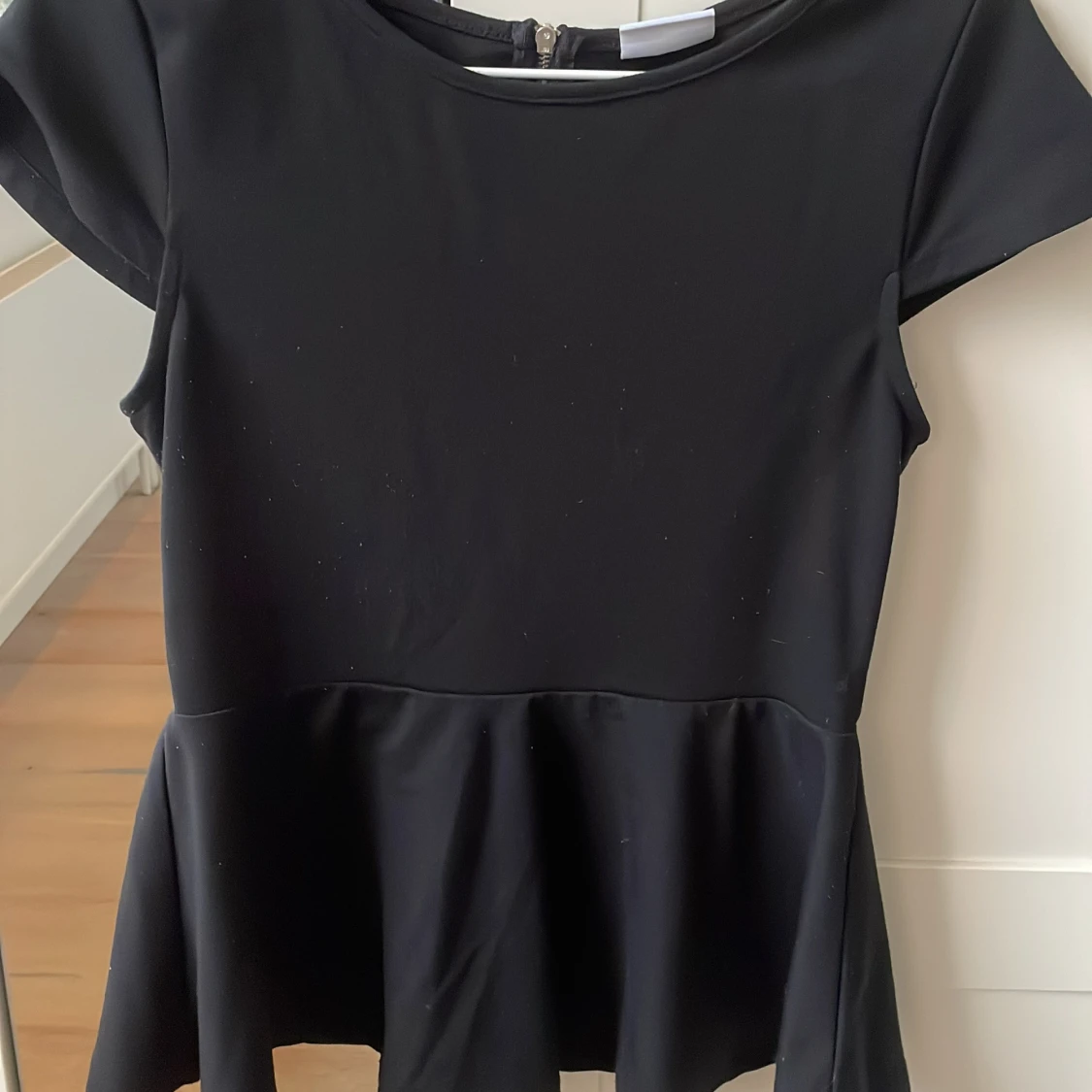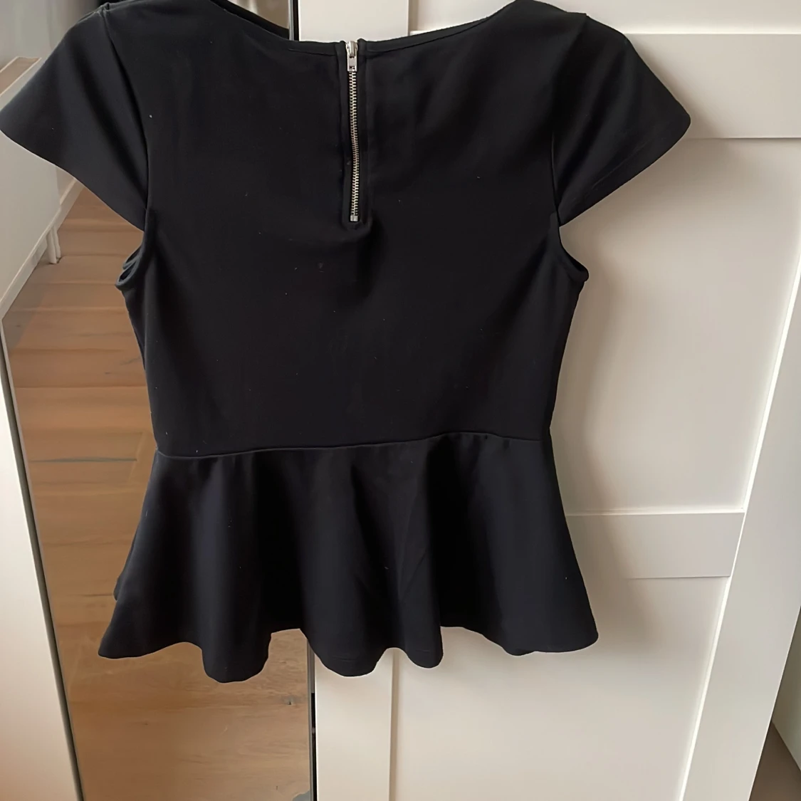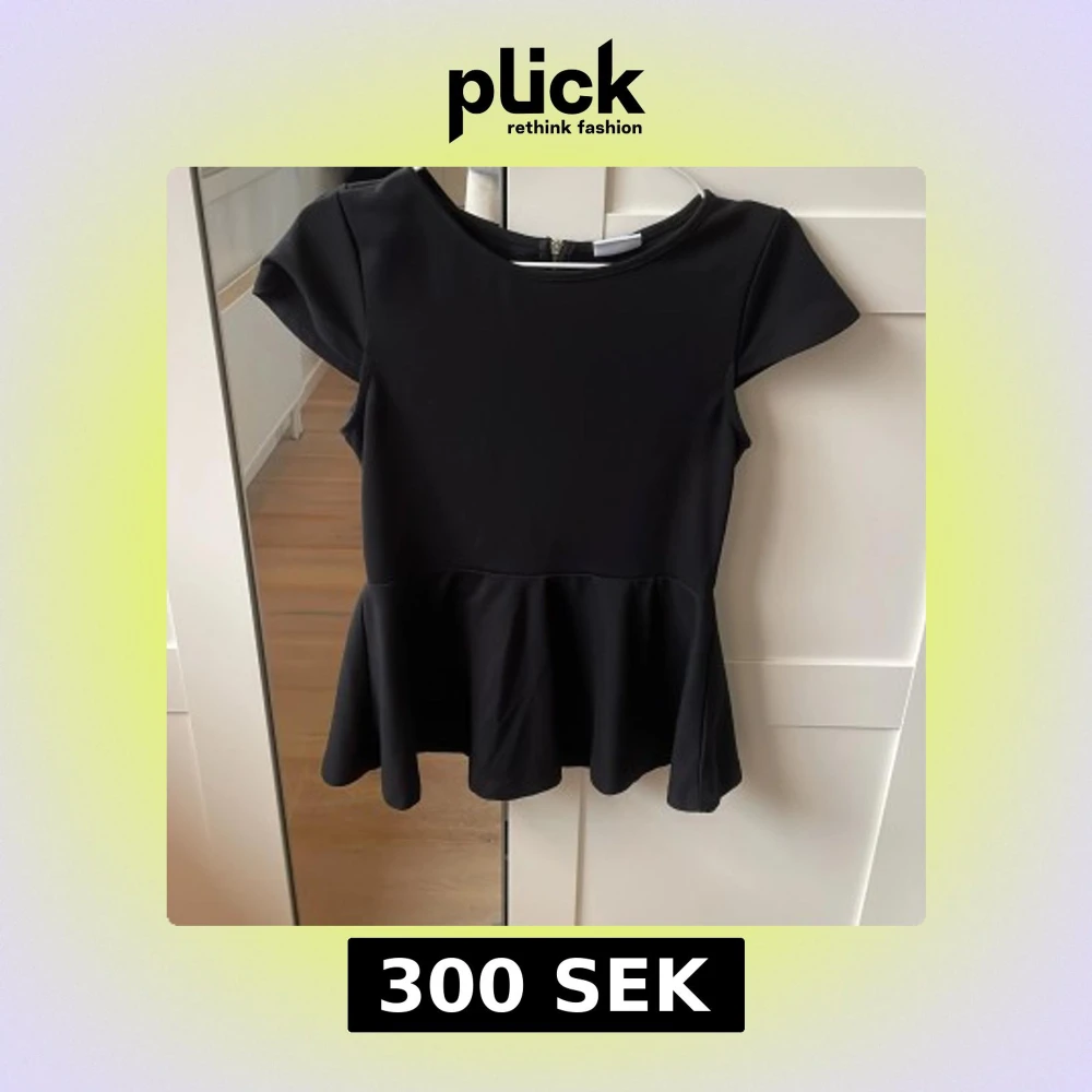 Snygg svart peplumtopp med korta ärmar och dragkedja i ryggen. Perfekt för en stilren look med en feminin touch. Toppen har en figursydd passform och är tillverkad i ett mjukt material.