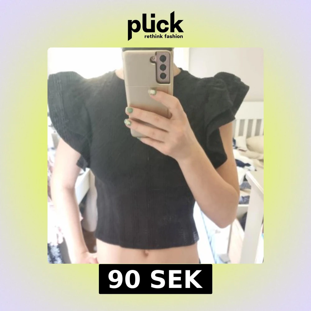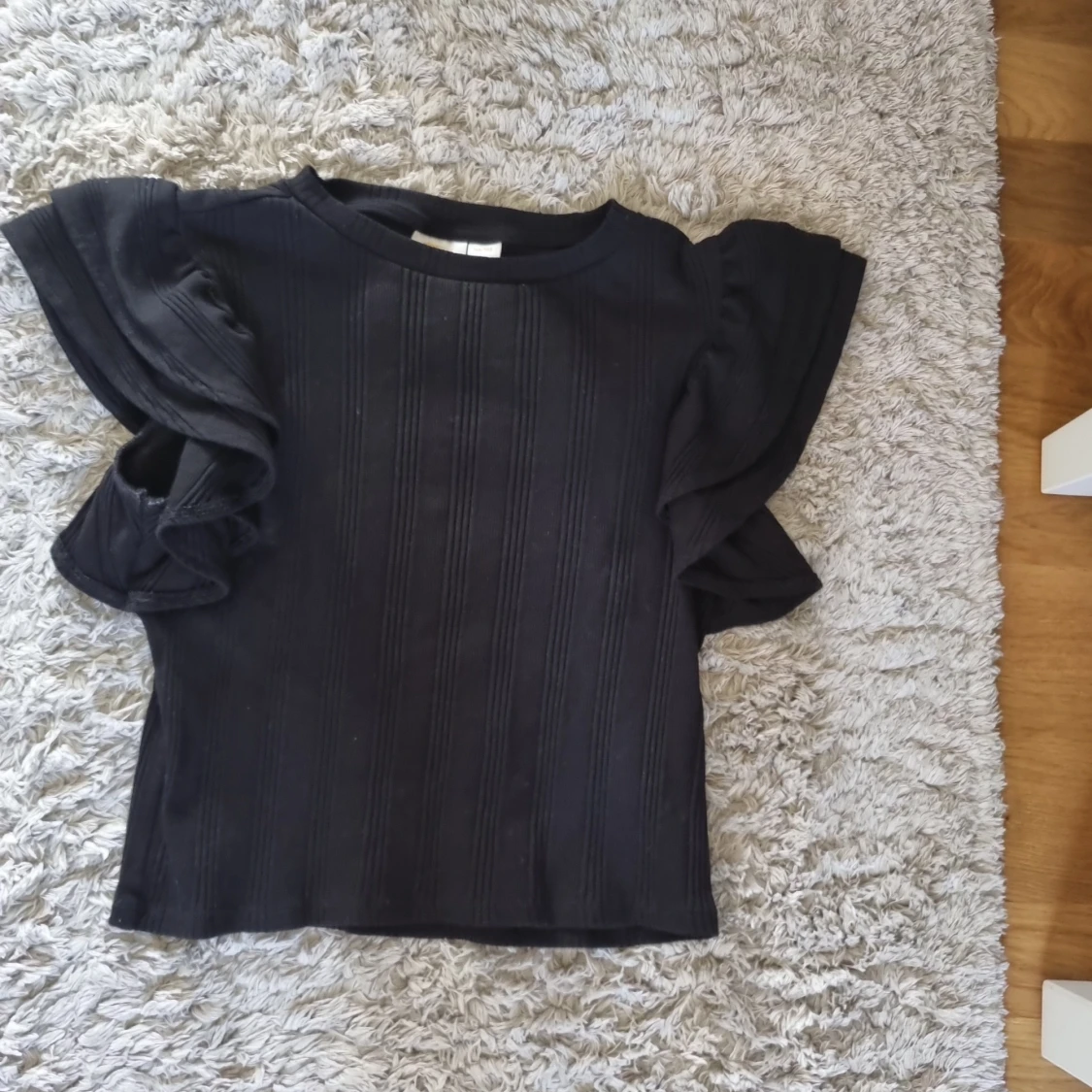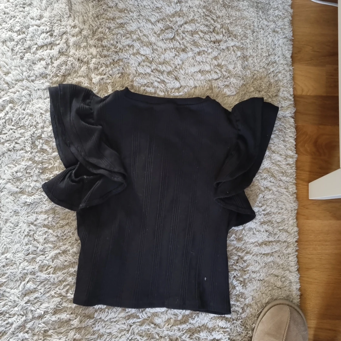 Säljer en svart topp från Gina Tricot med snygga volangärmar. Toppen är croppad och har en rund halsringning samt diskreta vertikala ränder i tyget. Perfekt för dig som vill ha en trendig och stilren look.Har användit några gånger men i nyskick. Frakt ingår inte. Säljer för att jag har växt ur dem.