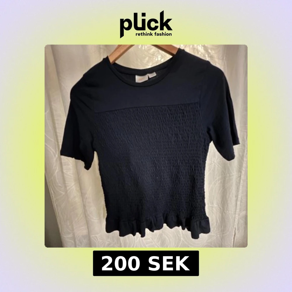 Snygg blå topp med korta ärmar och volangdetalj vid nederkanten. Toppen har en smockad textur på framsidan som ger en fin passform.