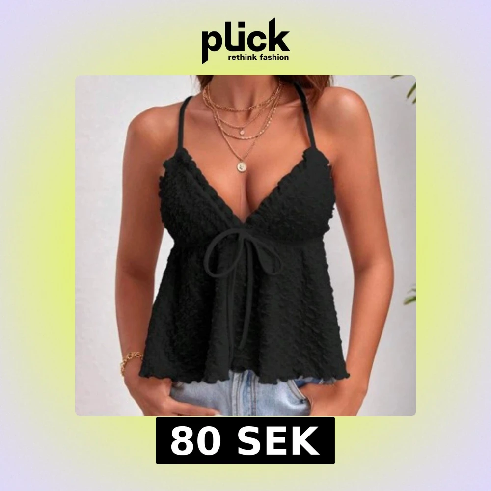 Säljer en svart topp med smala axelband och volangdetaljer. Toppen har en v-ringad design och knytning framtill. Perfekt för en stilren look. (Se mönster på sista bilden) pris kan diskuteras