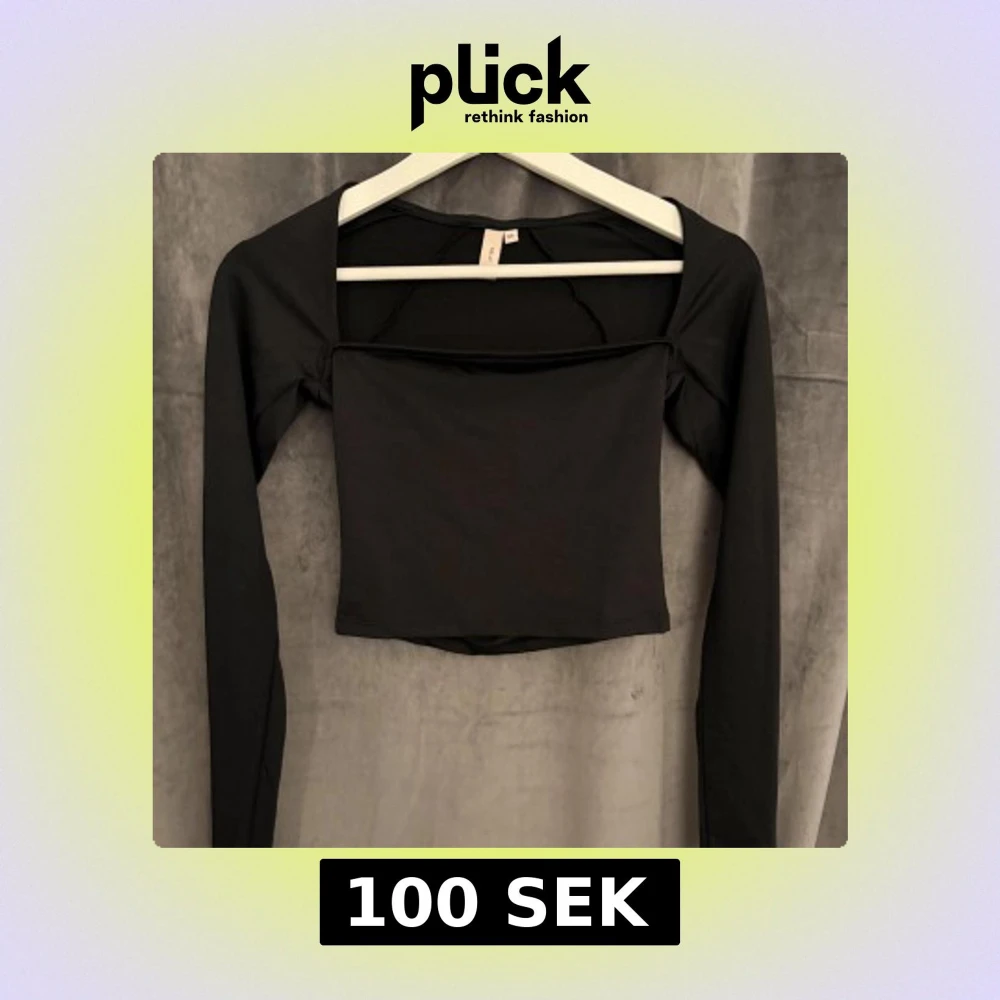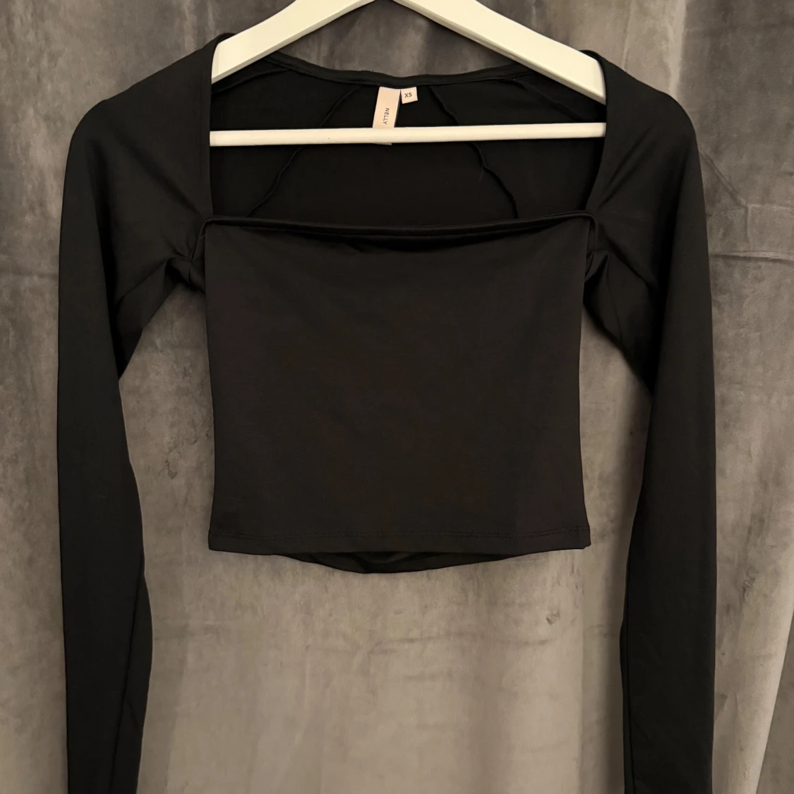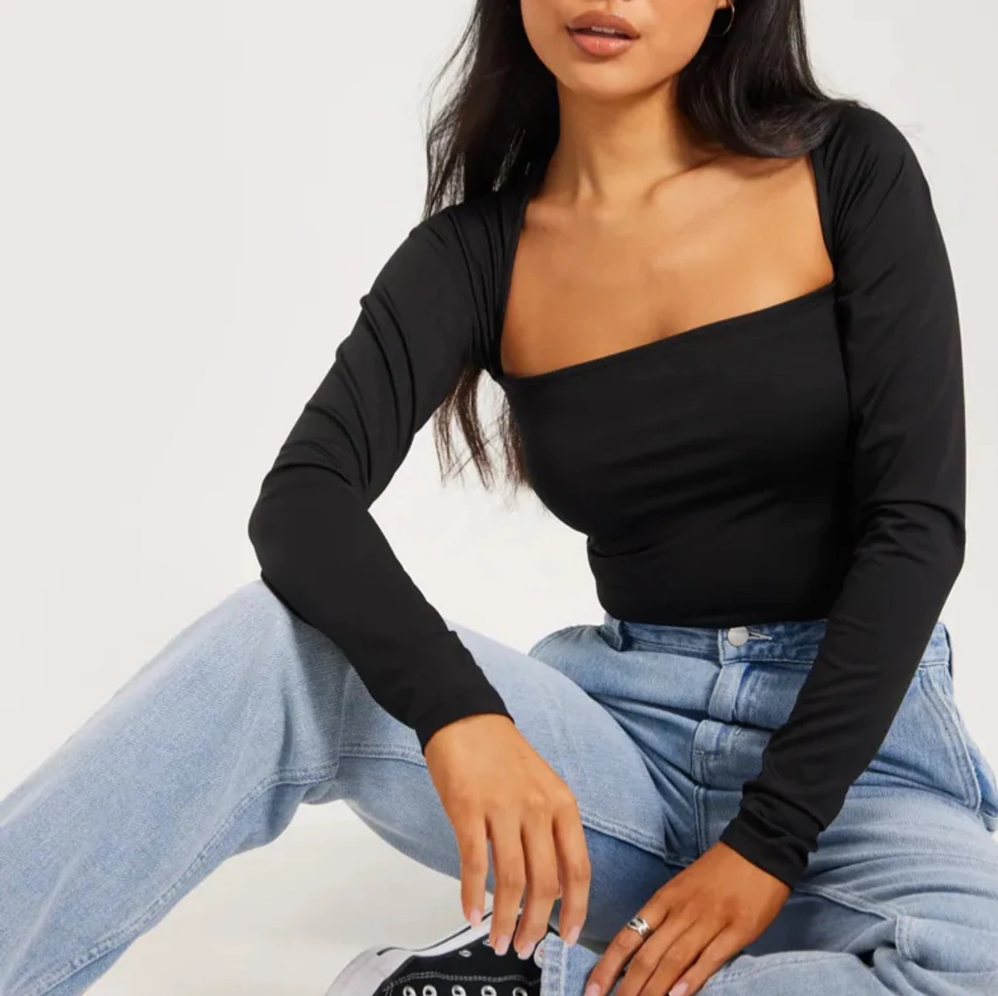 Snygg svart långärmad topp med fyrkantig urringning från NELLY. Storlek XS. Aldrig använd då den är för liten för mig.💞