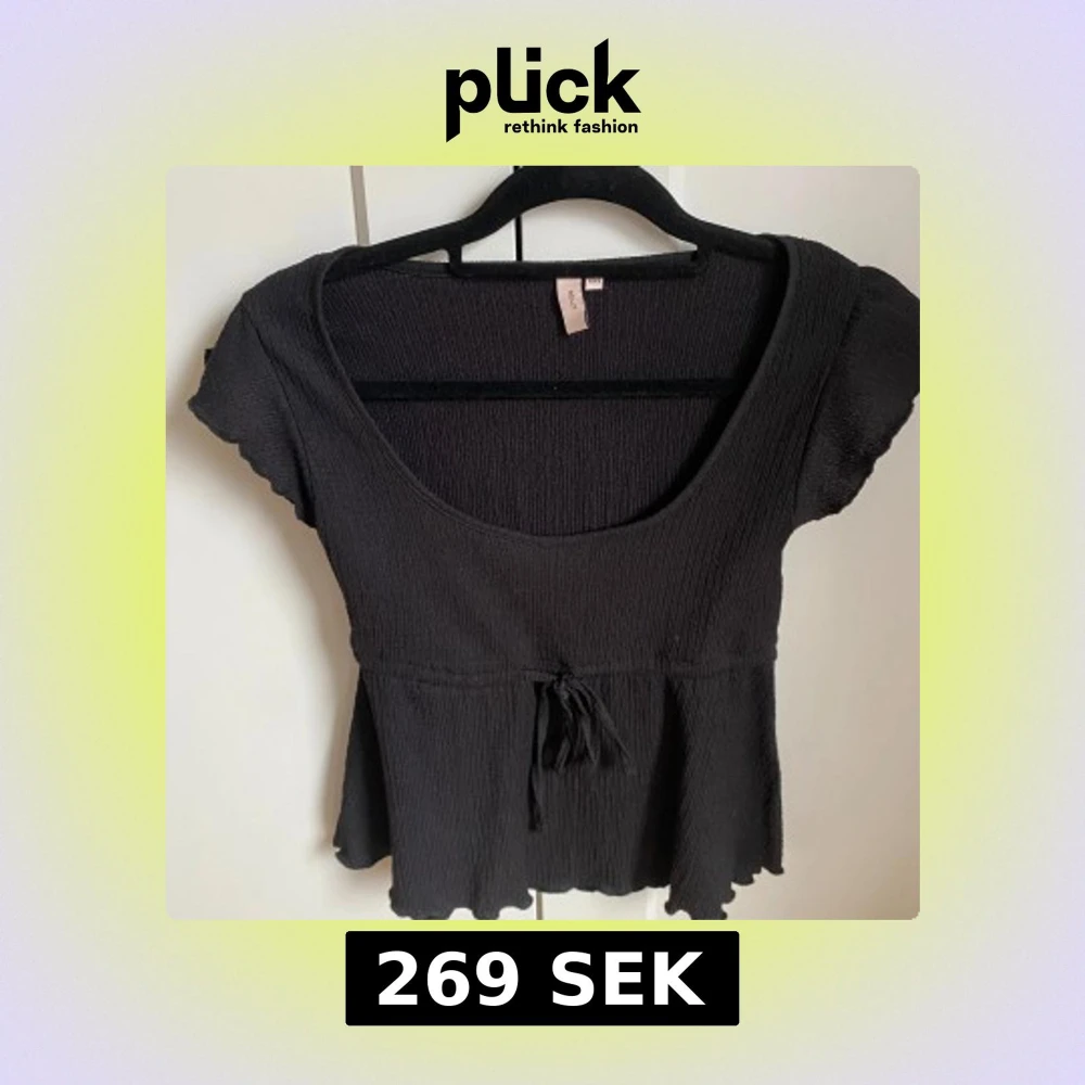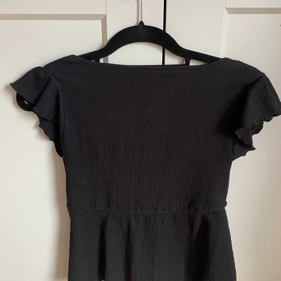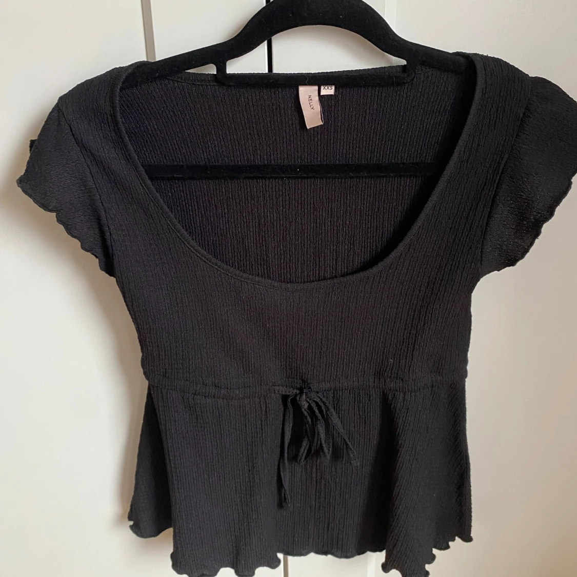 Snygg svart ribbad topp med korta ärmar och knytband i midjan. Toppen har en rundad halsringning och lätt volangdetalj vid ärmslut och nederkant. Supersöt💕