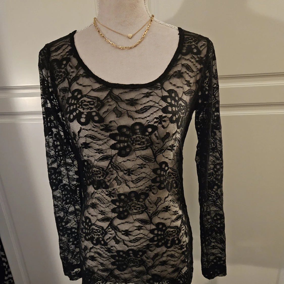 Säljer en svart långärmad spetstopp med blommigt mönster. Perfekt att styla över ett linne eller bh för en trendig look. Figurnära passform. Tyvärr är lappen bortklippt