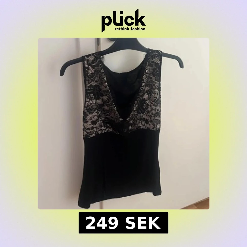 Säljer en svart ärmlös linne-topp med djup v-ringning. Toppen har blommigt spetsmönster över bysten och slät svart nederdel.