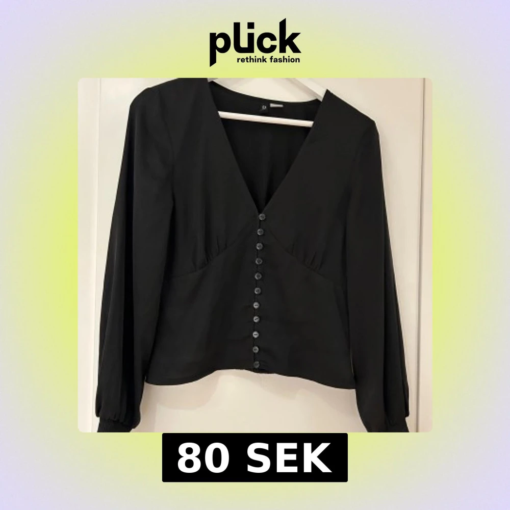 Snygg svart blus med djup v-ringning med knappar längs framsidan. De. Är sparsamt använd och sitter fint. Den är i storlek 38