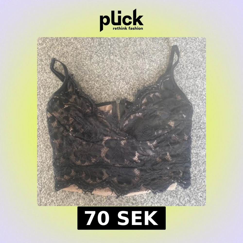 Supersnygg croppad linnetopp i svart spets med blommigt mönster och tunna axelband. Toppen har en dragkedja bak och nude-färgad underdel som ger en cool kontrast. Perfekt för att lyfta vilken outfit som helst.