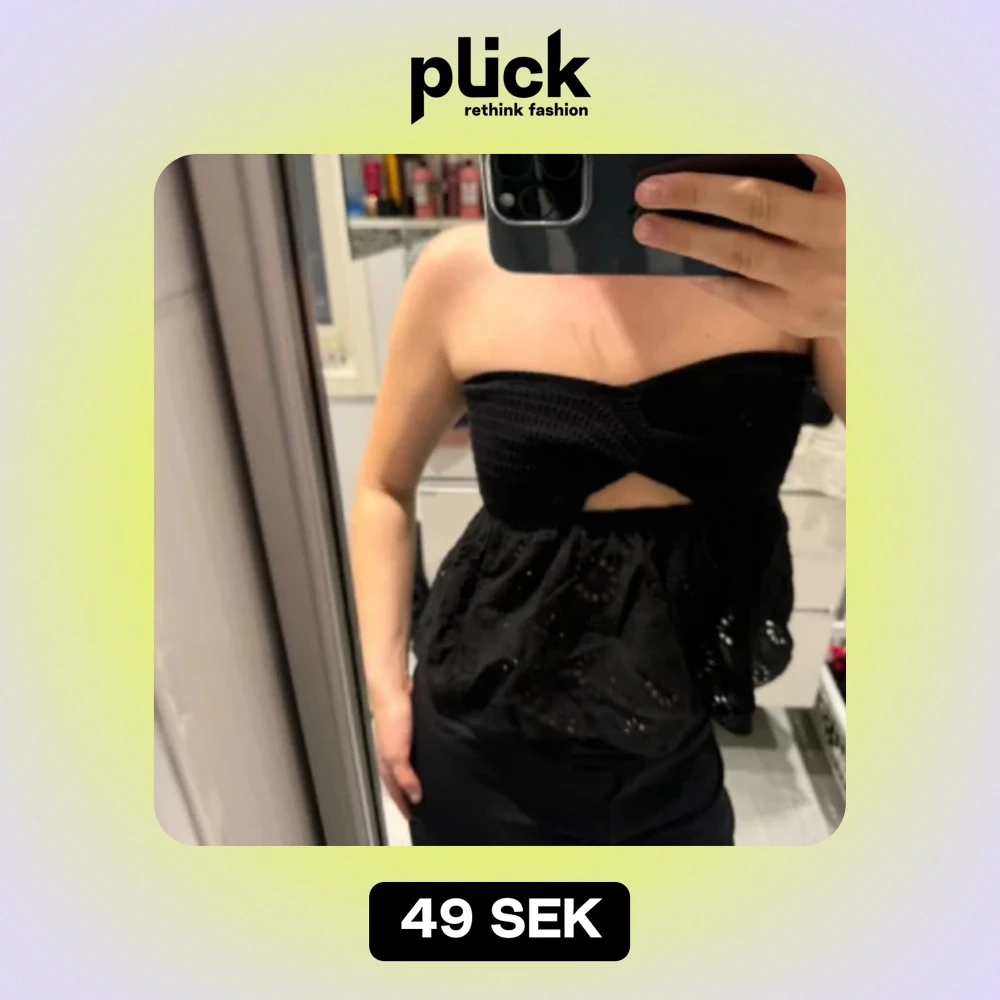 En svart tubtopp med spetsdetaljer. Toppen är ärmlös och har en tight passform. en defekt på sida 2