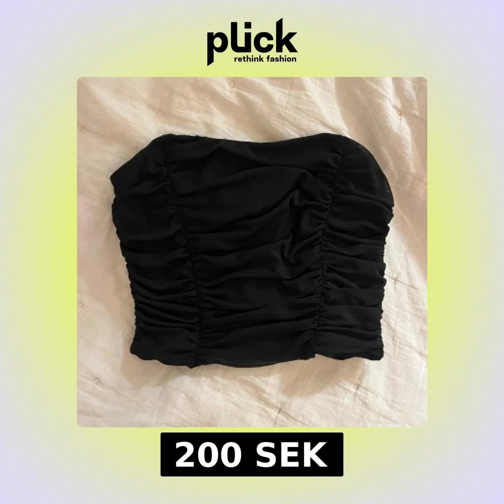 Svart tubtopp från Forever 21 med snygga rynkade detaljer framtill. Toppen är axelbandslös och har en tight passform som sitter på plats. Använd ensast ett fåtal gånger💋