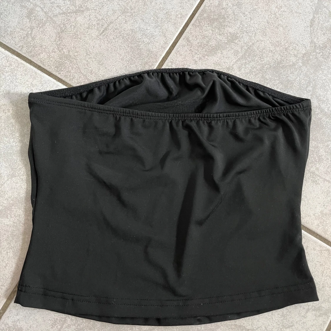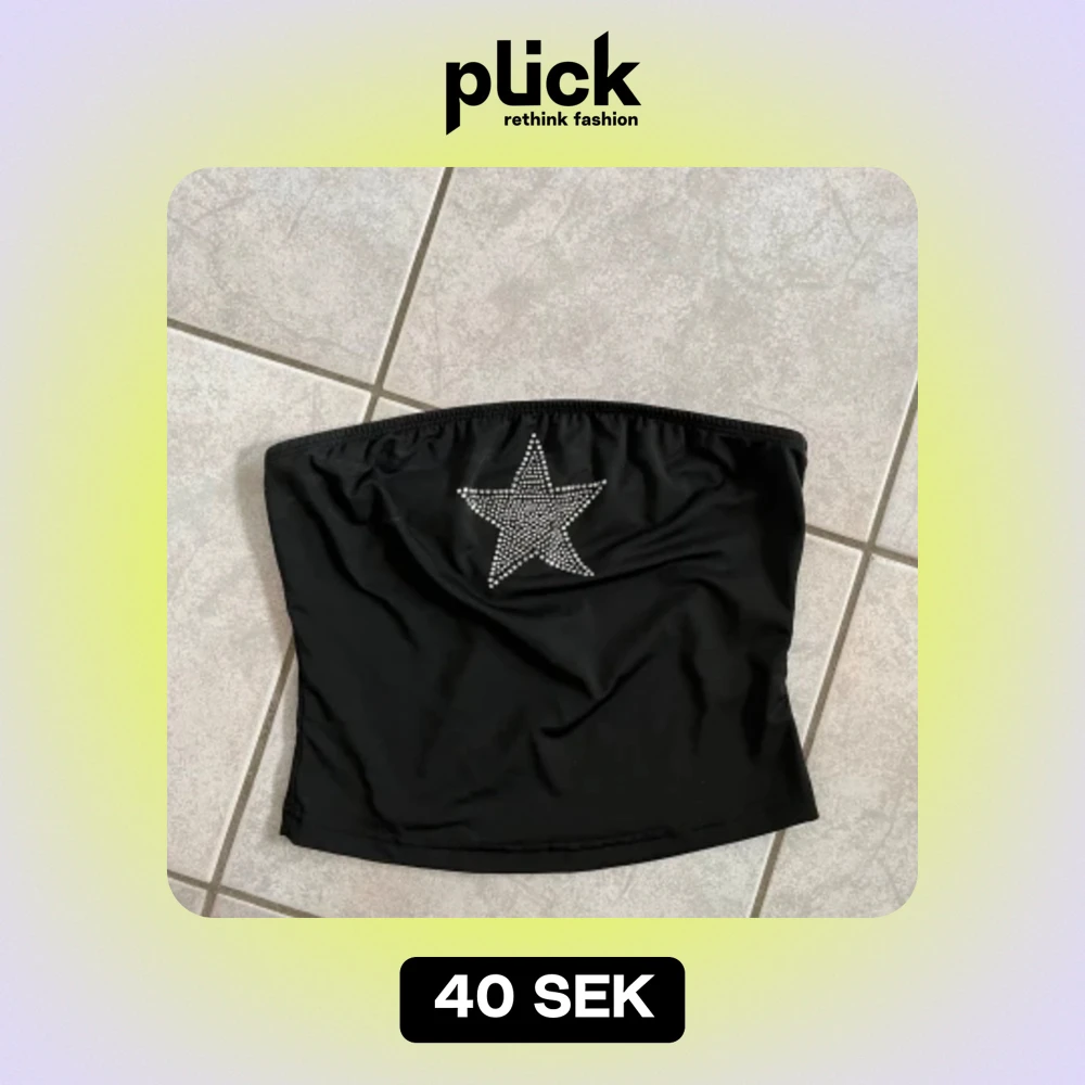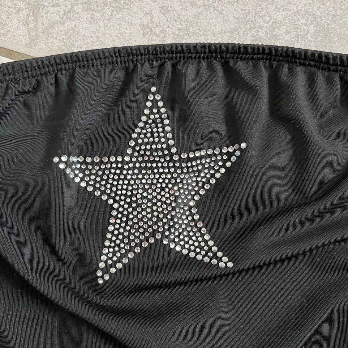 Snygg svart tubtopp med en glittrig stjärna framtill. Perfekt för festliga tillfällen eller en utekväll. Toppen är axelbandslös och har en tight passform som sitter bra på plats. skriv vid frågor💗