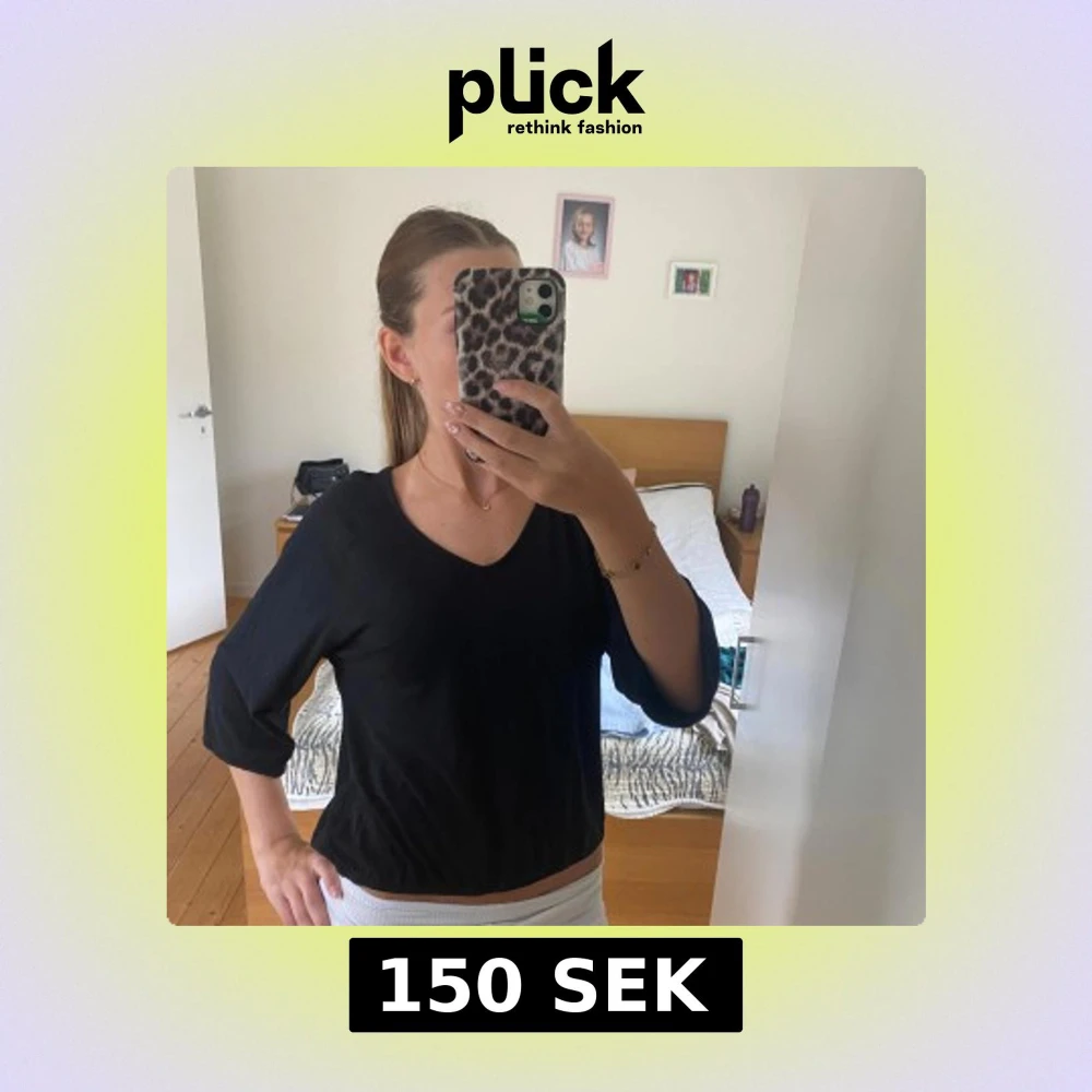 Säljer en svart blus med v-ringning och trekvartsärmar. Toppen har en loose passform och är croppad vid midjan. Perfekt att styla med jeans eller kjol för en chill look. Materialet känns mjukt och lätt mot huden.