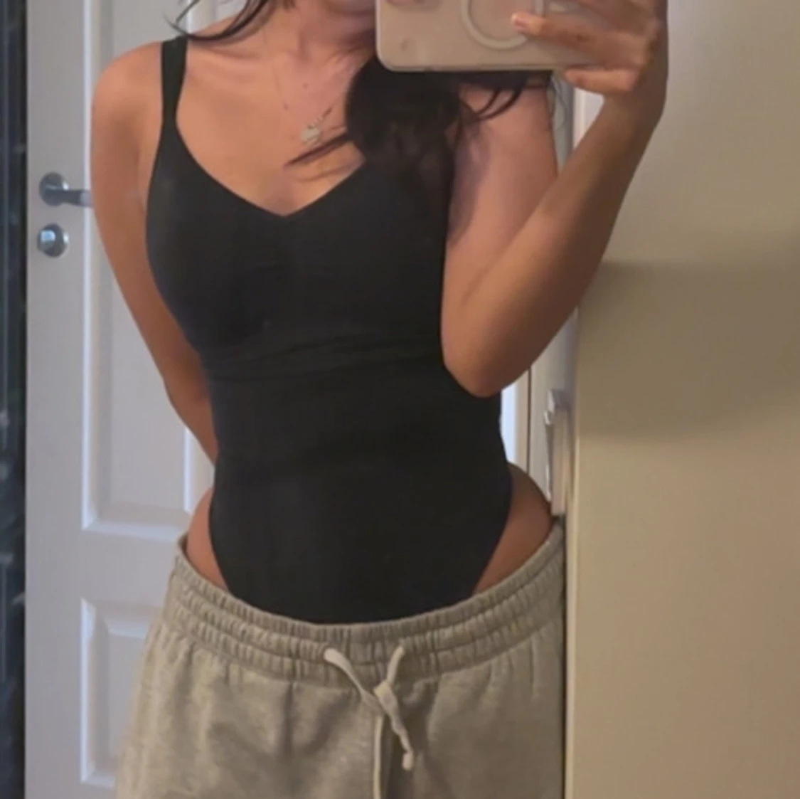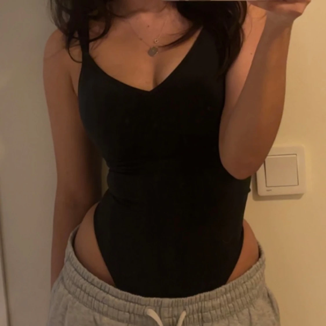 Säljer en svart bodysuit med v-ringning och breda axelband. Sitter tight och har en enkel, stilren design som passar till många olika outfits.
