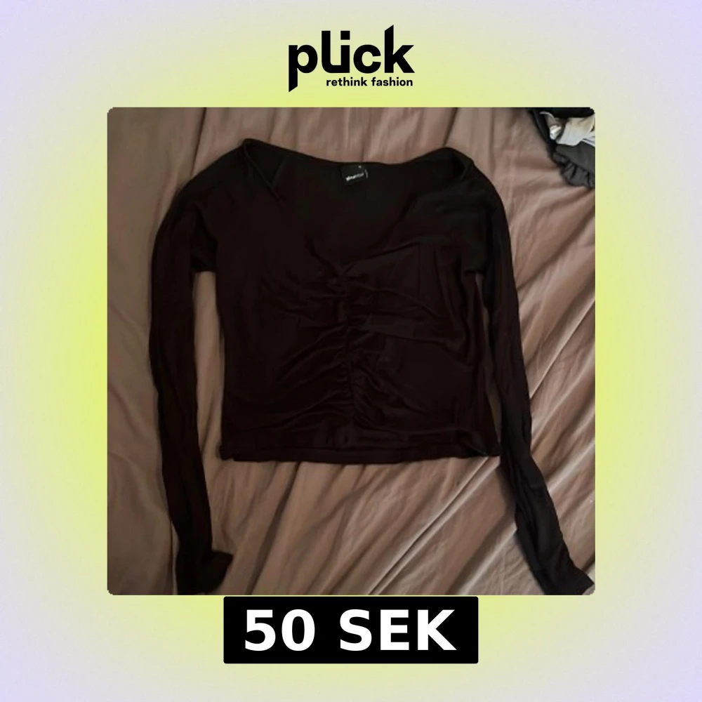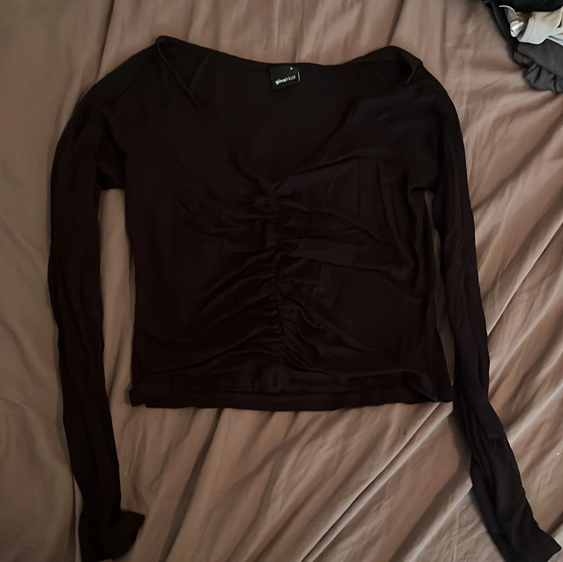 Snygg svart långärmad topp från Gina Tricot med v-ringning och rynkade detaljer framtill. Tunn och stretchig, perfekt att styla med jeans eller kjol. Enkel men trendig design som passar till många olika looks.