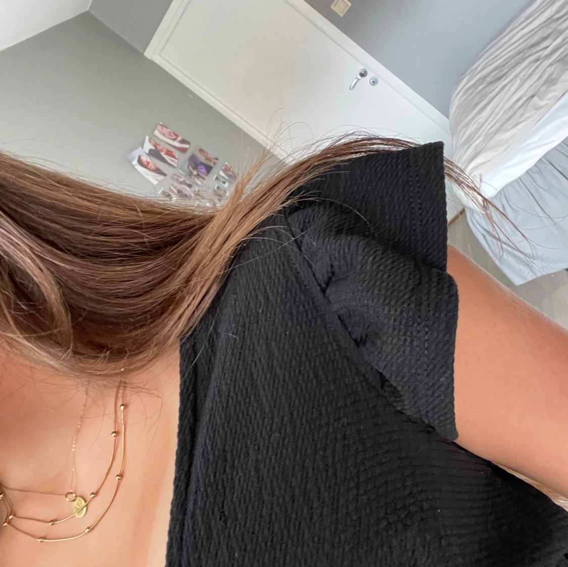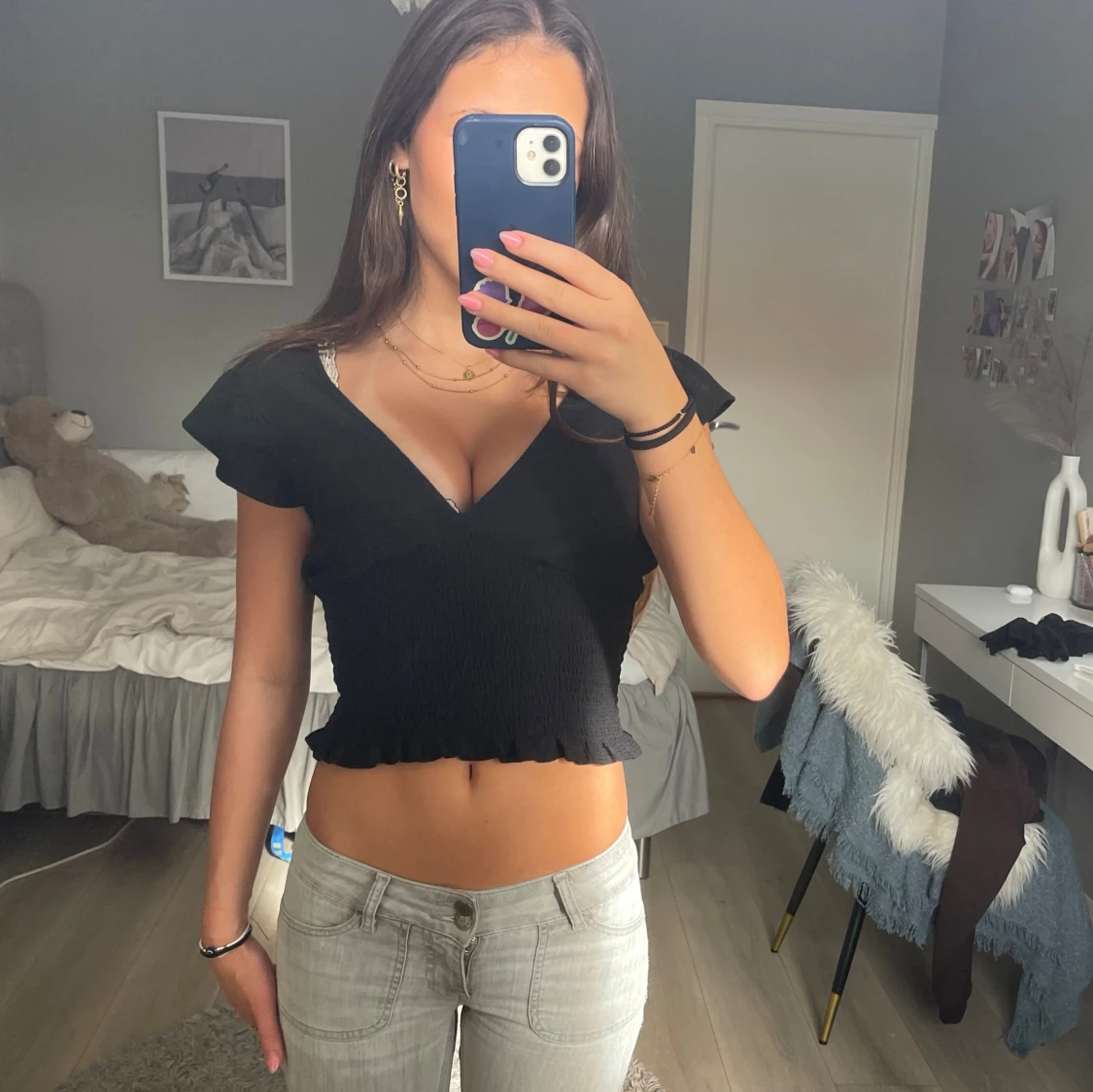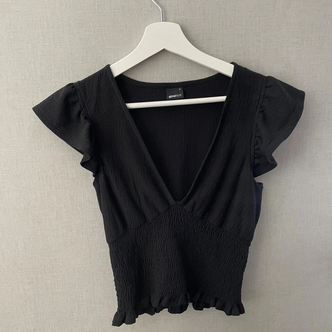 Svart croppad topp från Gina Tricot med v-ringning och volangärmar. Toppen har smockad midja och volangkant nedtill. Materialet är lätt strukturerat och stretchigt, vilket gör den bekväm och snygg till jeans eller kjol.