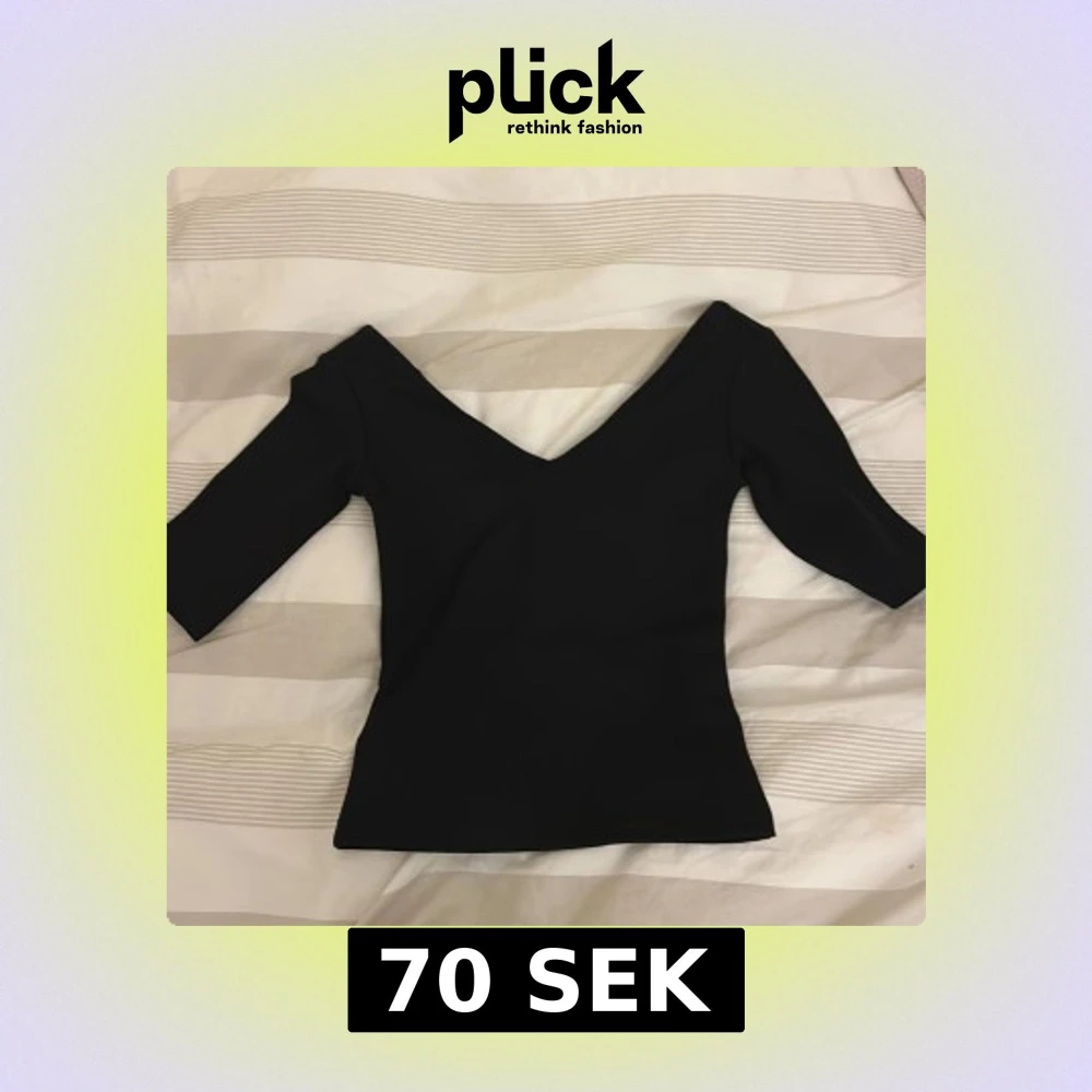Svart topp från H&M med djup v-ringning och trekvartsärm. Tillverkad i 62% LivaEco viskos för en mjuk och följsam känsla. Snygg, enkel och passar perfekt till jeans eller kjol. Stilren design utan mönster eller extra detaljer. Helt ny aldrig använd.