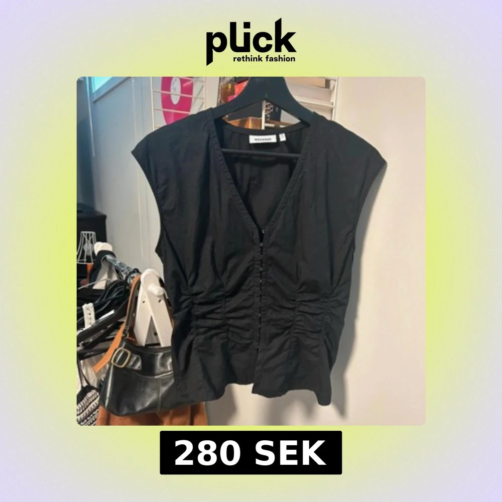 Svart ärmlös topp från Weekday med v-ringning och knappar framtill. Toppen har rynkade detaljer längs sidorna som ger en snygg form. Perfekt att styla med jeans eller kjol för en cool look.