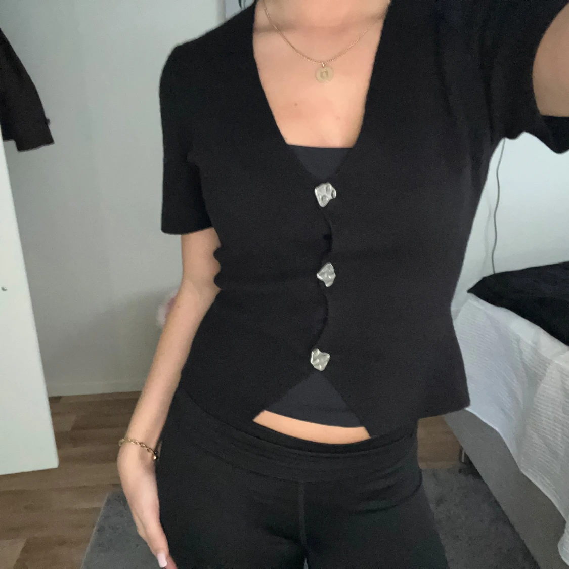 Svart topp med v-ringning och korta ärmar. Slutsåld!