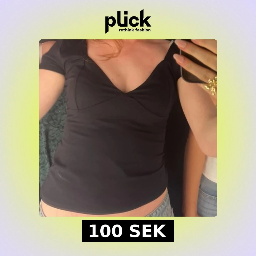Snygg svart topp med v-ringad hals och korta ärmar. Figurnära passform som framhäver siluetten. Stilren design utan mönster, perfekt att matcha med jeans eller kjol. Materialet känns mjukt och följsamt mot huden.