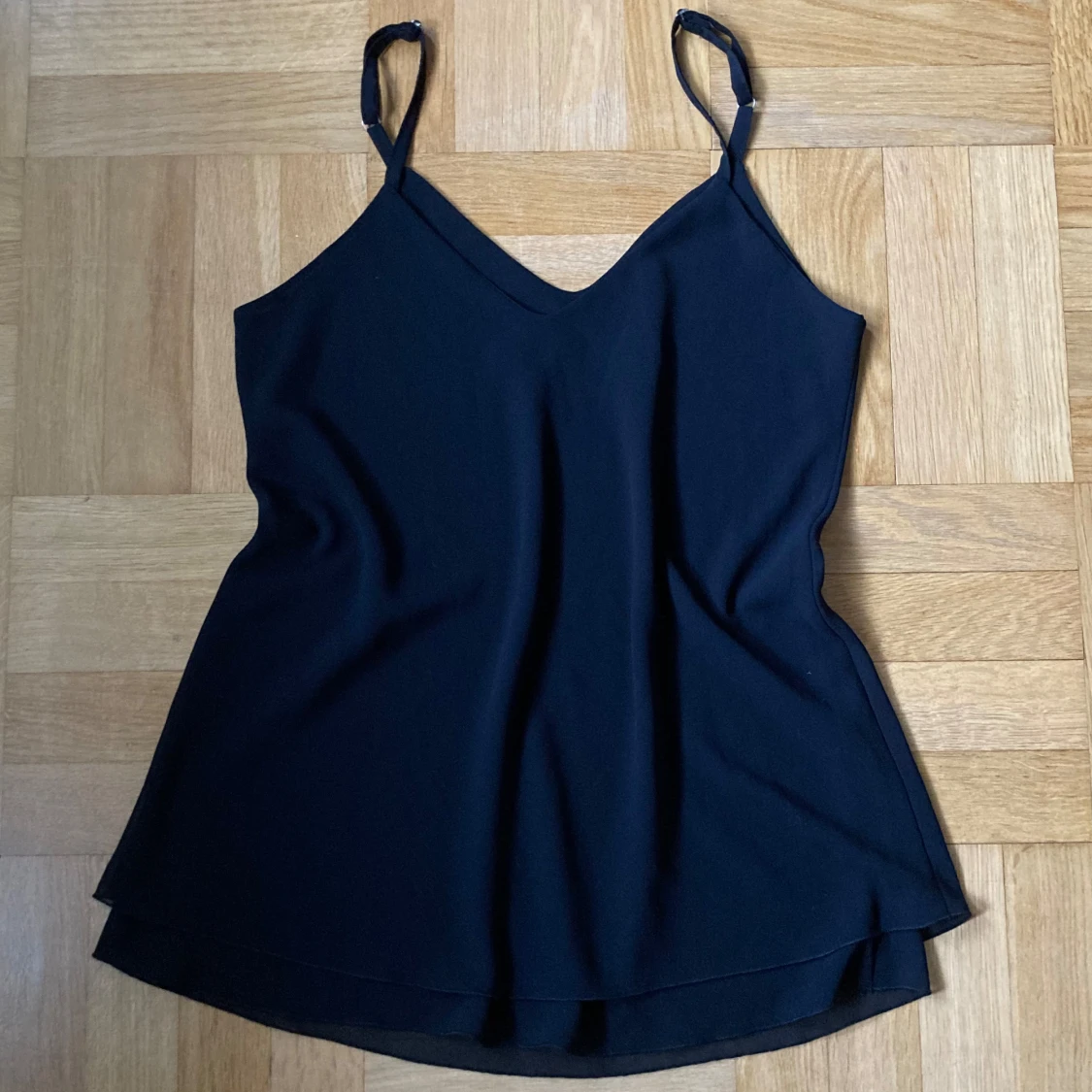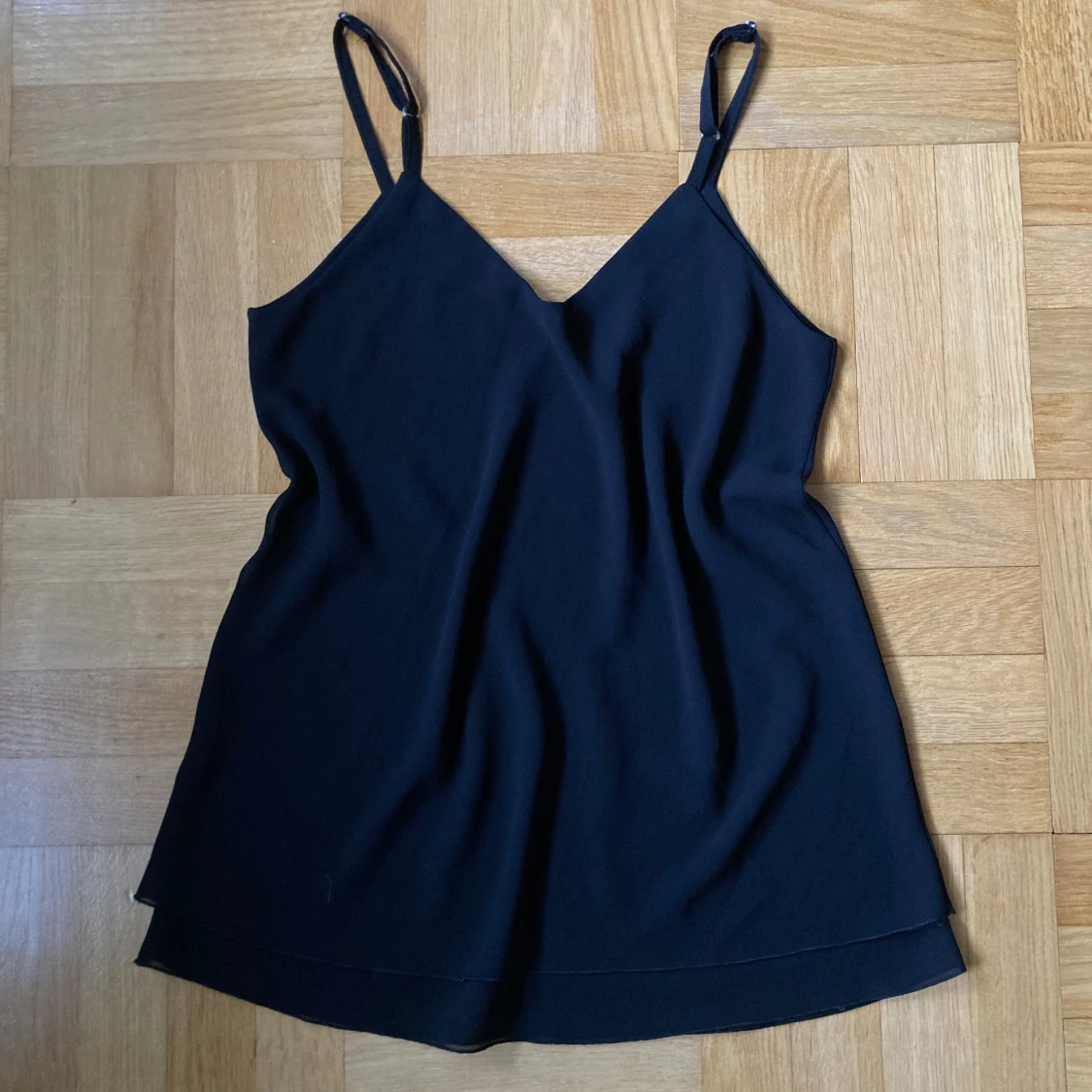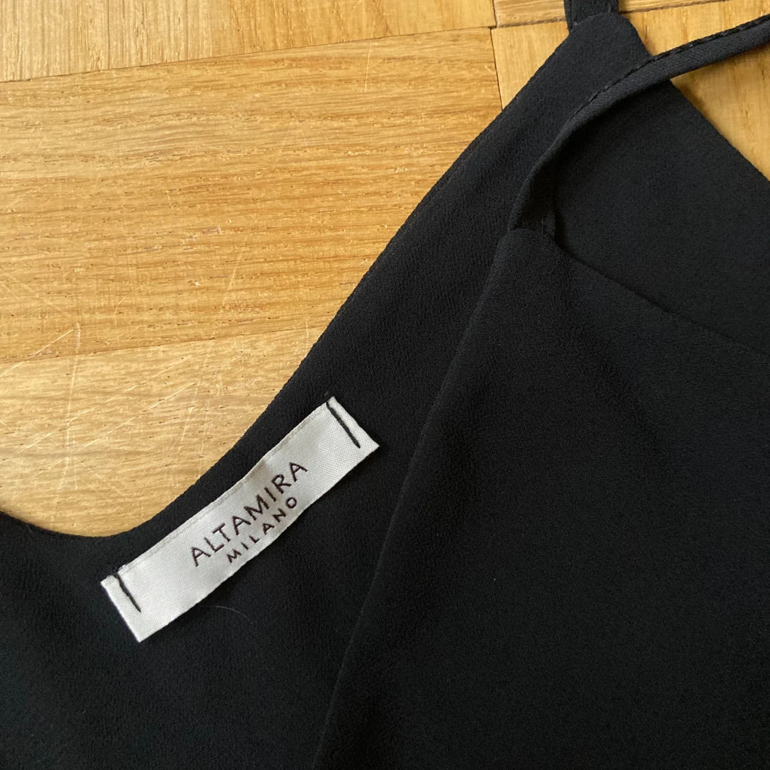 Svart linne från Altamira Milano med smala justerbara axelband och volang-detalj längst ner!