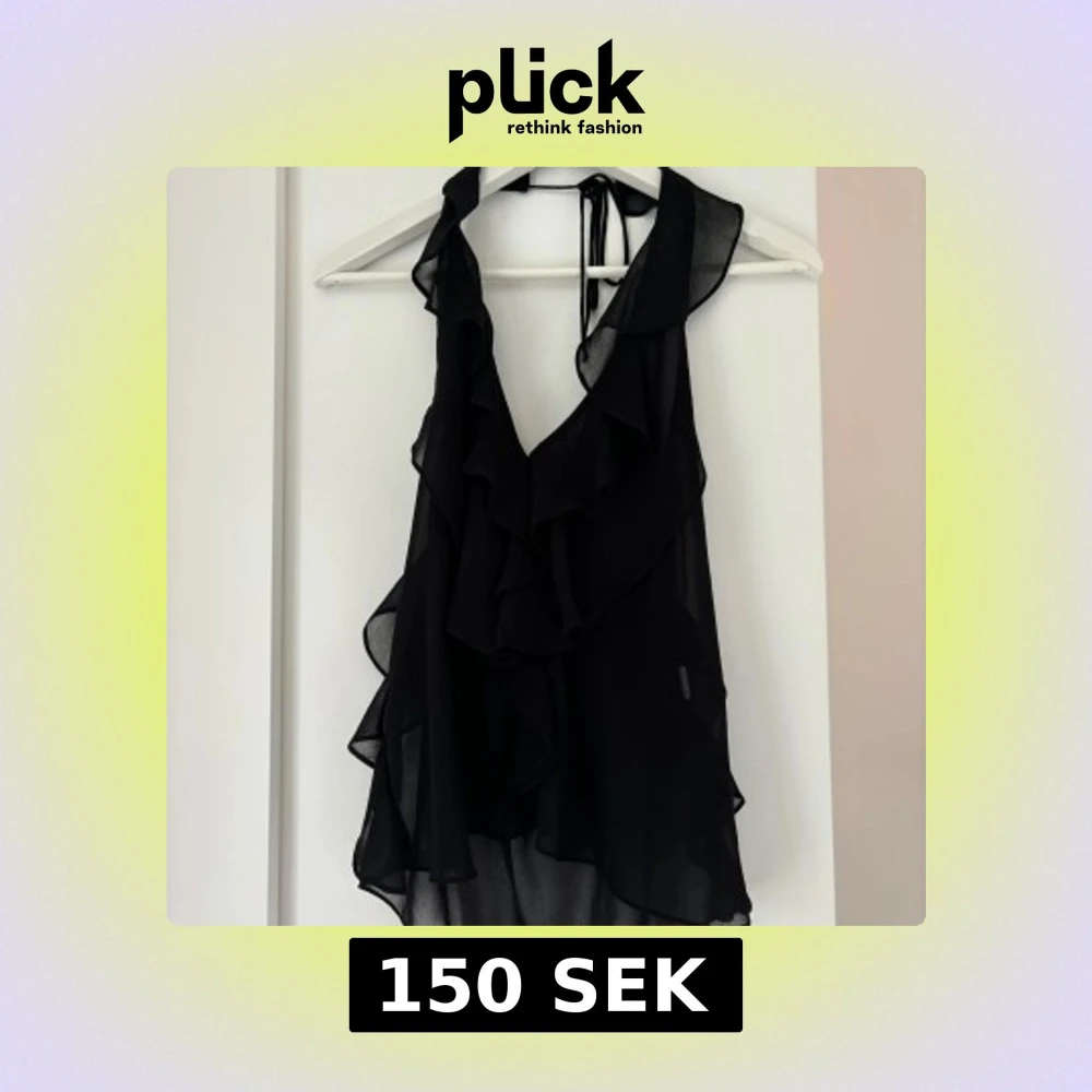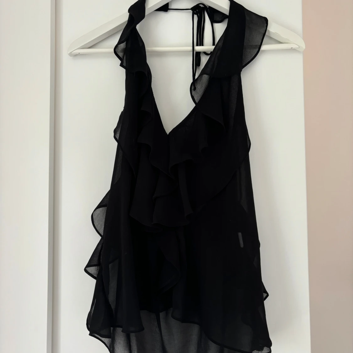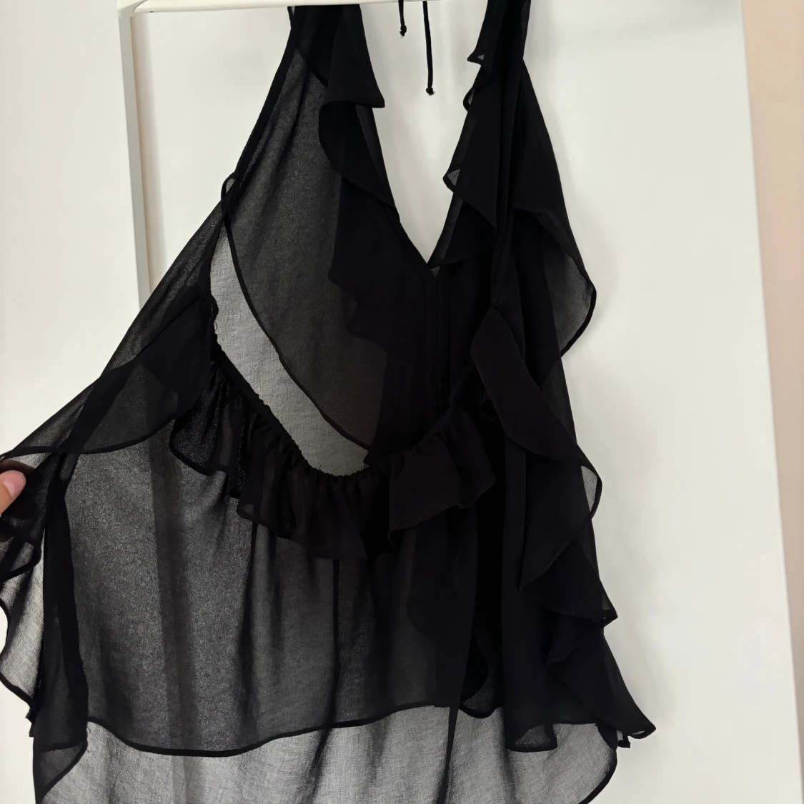 Säljer en svart, transparent linnetopp med volanger och djup v-ringning. Toppen har knyt i nacken och är ärmlös, vilket ger en snygg och luftig look. Perfekt för dig som gillar att sticka ut med coola detaljer och flowy material.