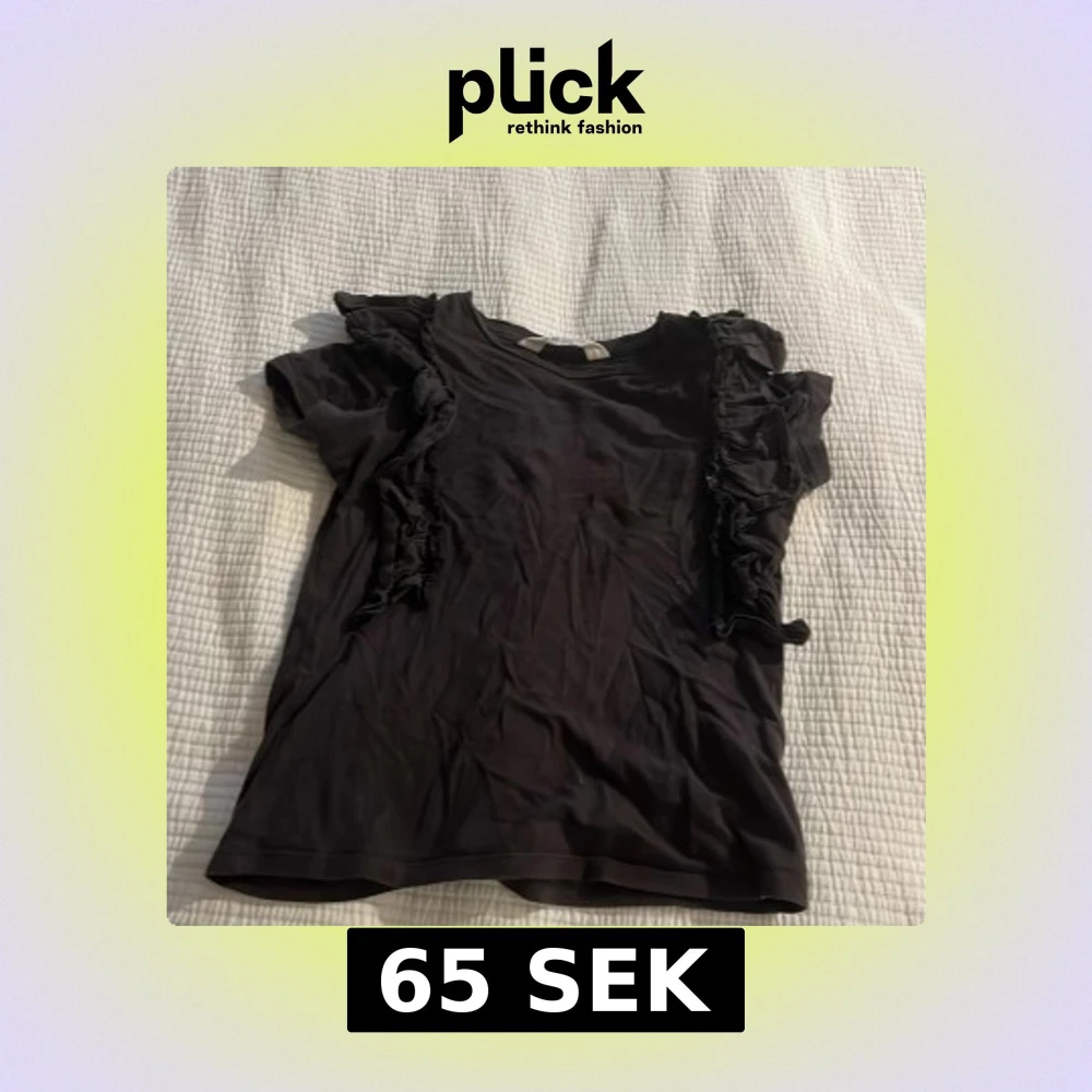Svart blus från H&M med korta ärmar och snygga volangdetaljer längs axlarna. Toppens material är mjukt och lätt, perfekt för att ge outfiten en extra touch. Enkel att matcha med både jeans och kjol för en trendig look.