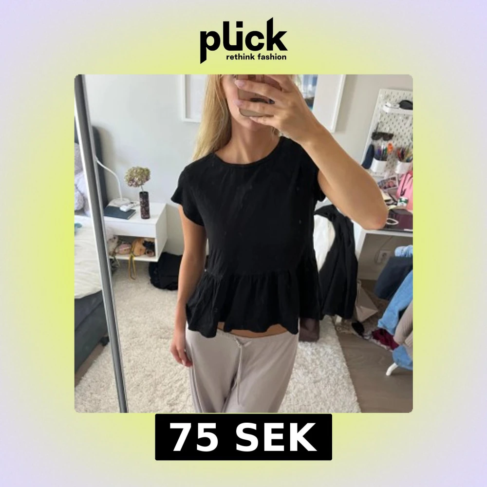 Säljer en svart blus med volang nertill och korta ärmar. Toppen har rund halsringning och en lös, luftig passform som ger en avslappnad vibe. Perfekt att styla med jeans eller kjol för en enkel men snygg look.