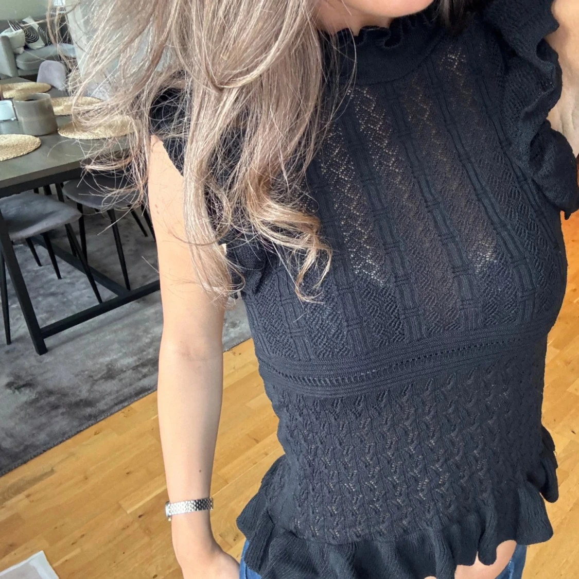 Svart volangblus med spetsdetaljer