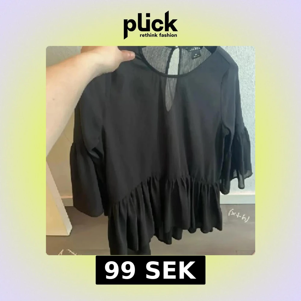 Säljer en svart blus från Jacquelin de Yong med volang nertill och trekvartsärmar. Blusen har rund halsringning och en liten öppning bak i nacken. Tunt och luftigt material som ger ett snyggt fall.