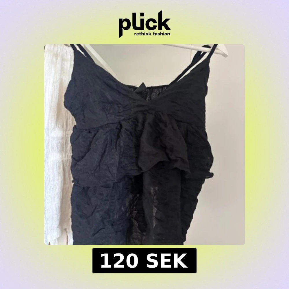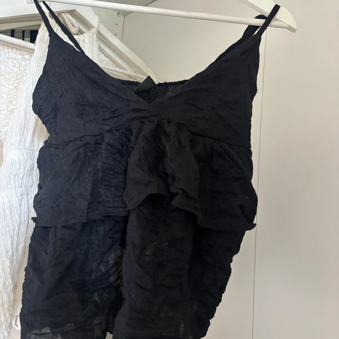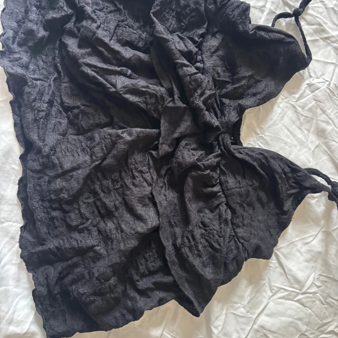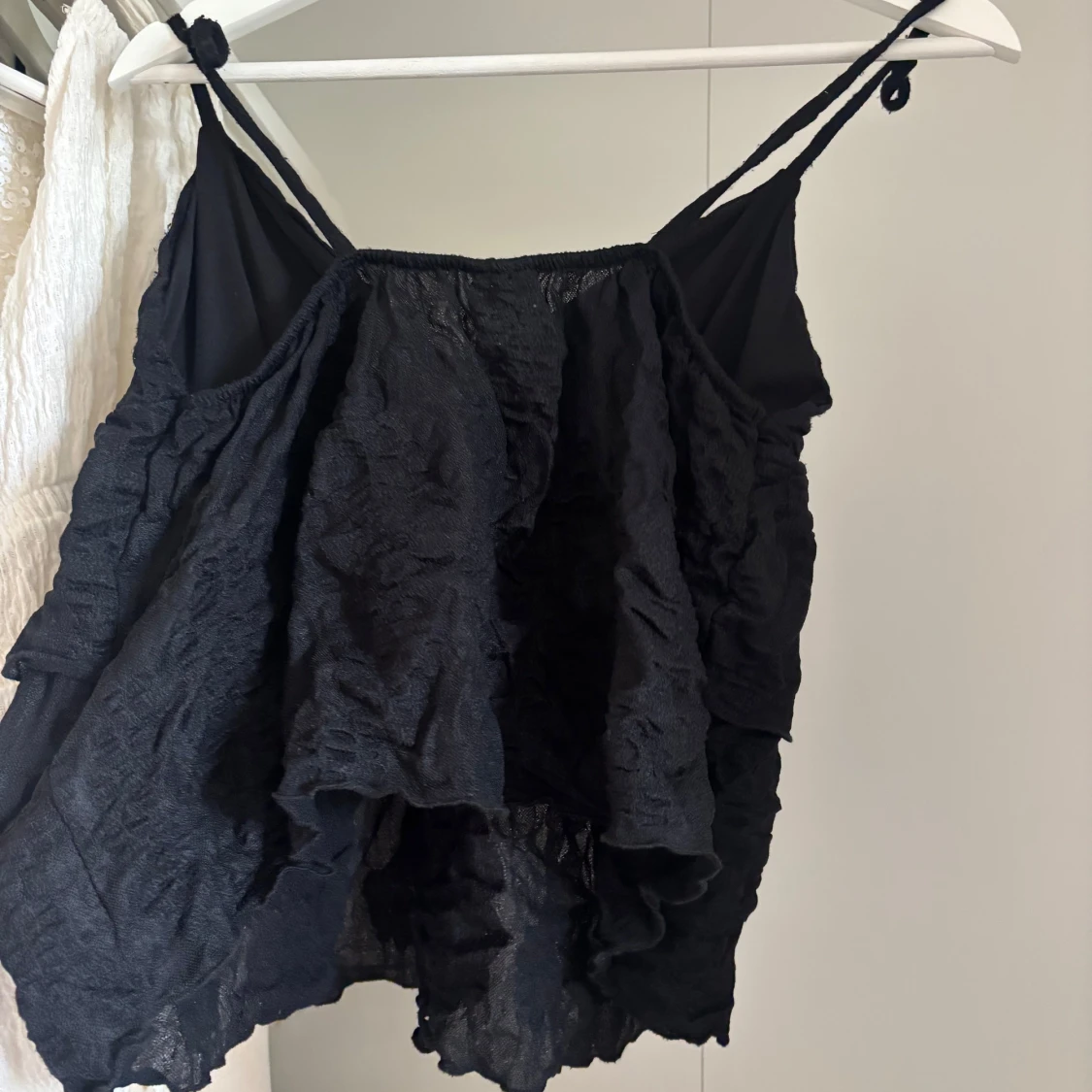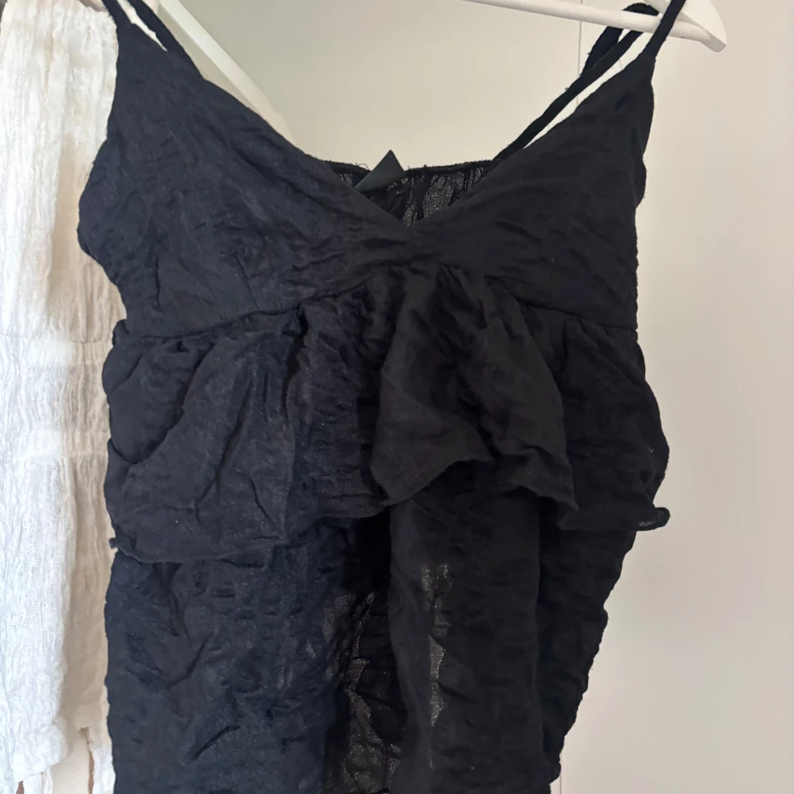 HELT NY, UTAN PRISLAPP! Svart linnetopp med smala axelband och snygga volangdetaljer framtill. Toppen har en skrynklig textur och v-ringad hals, vilket ger en cool och avslappnad vibe. Perfekt för dig som gillar att sticka ut med lager på lager och mjuka material.