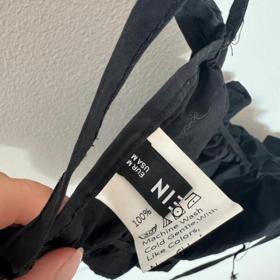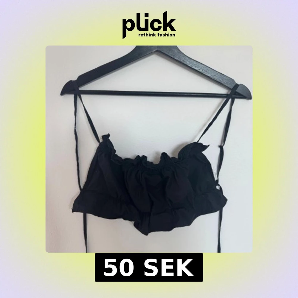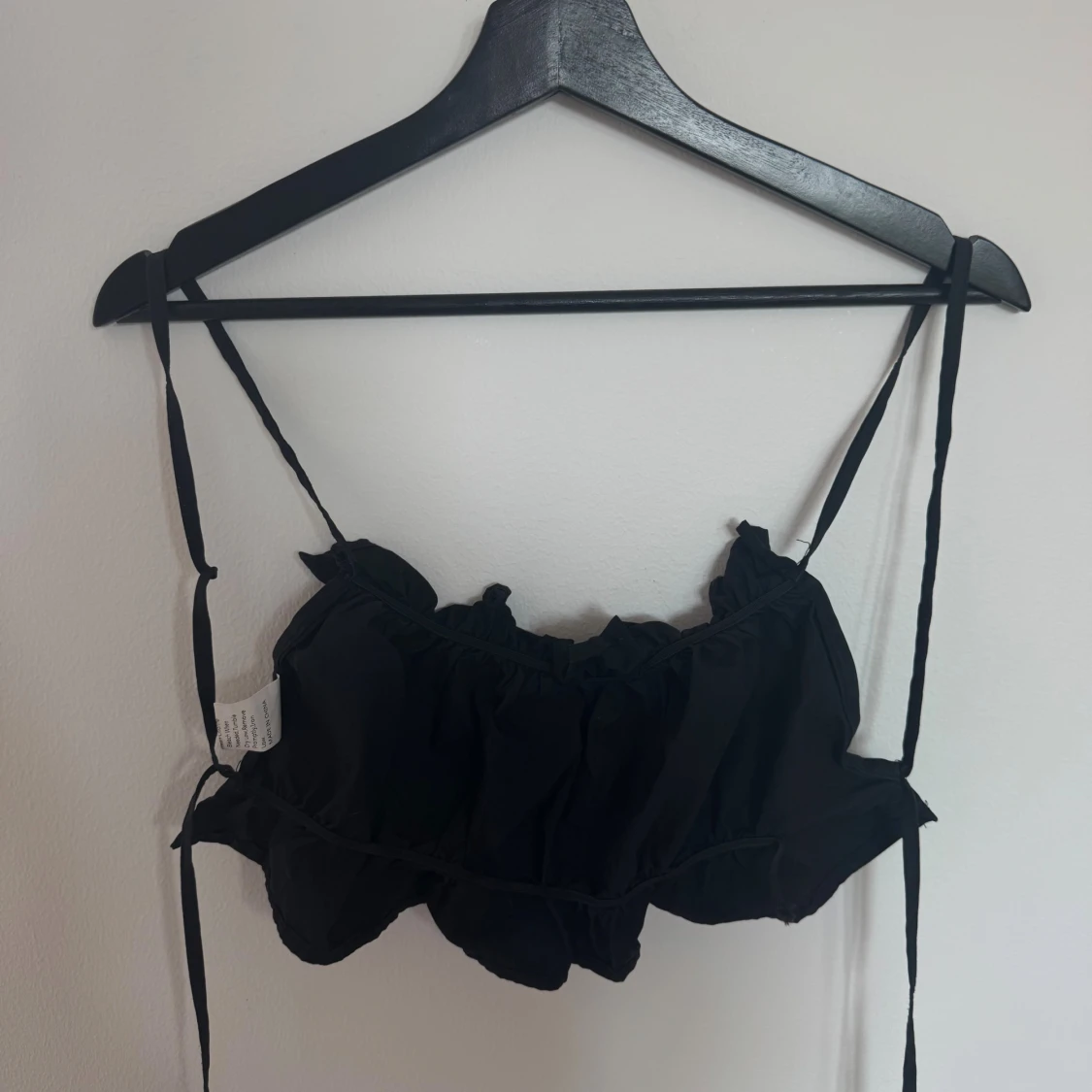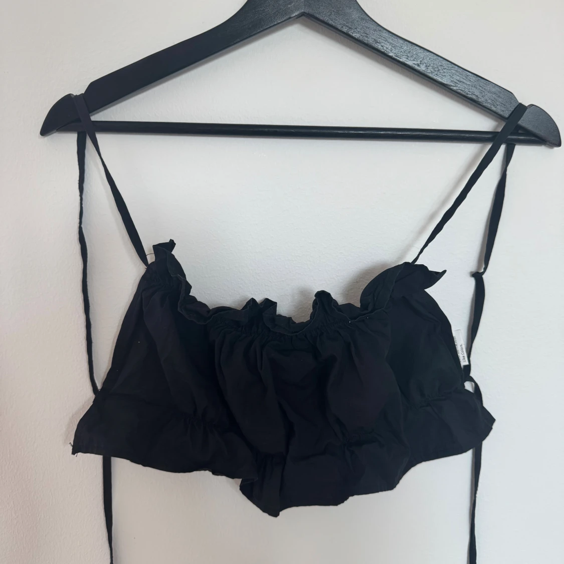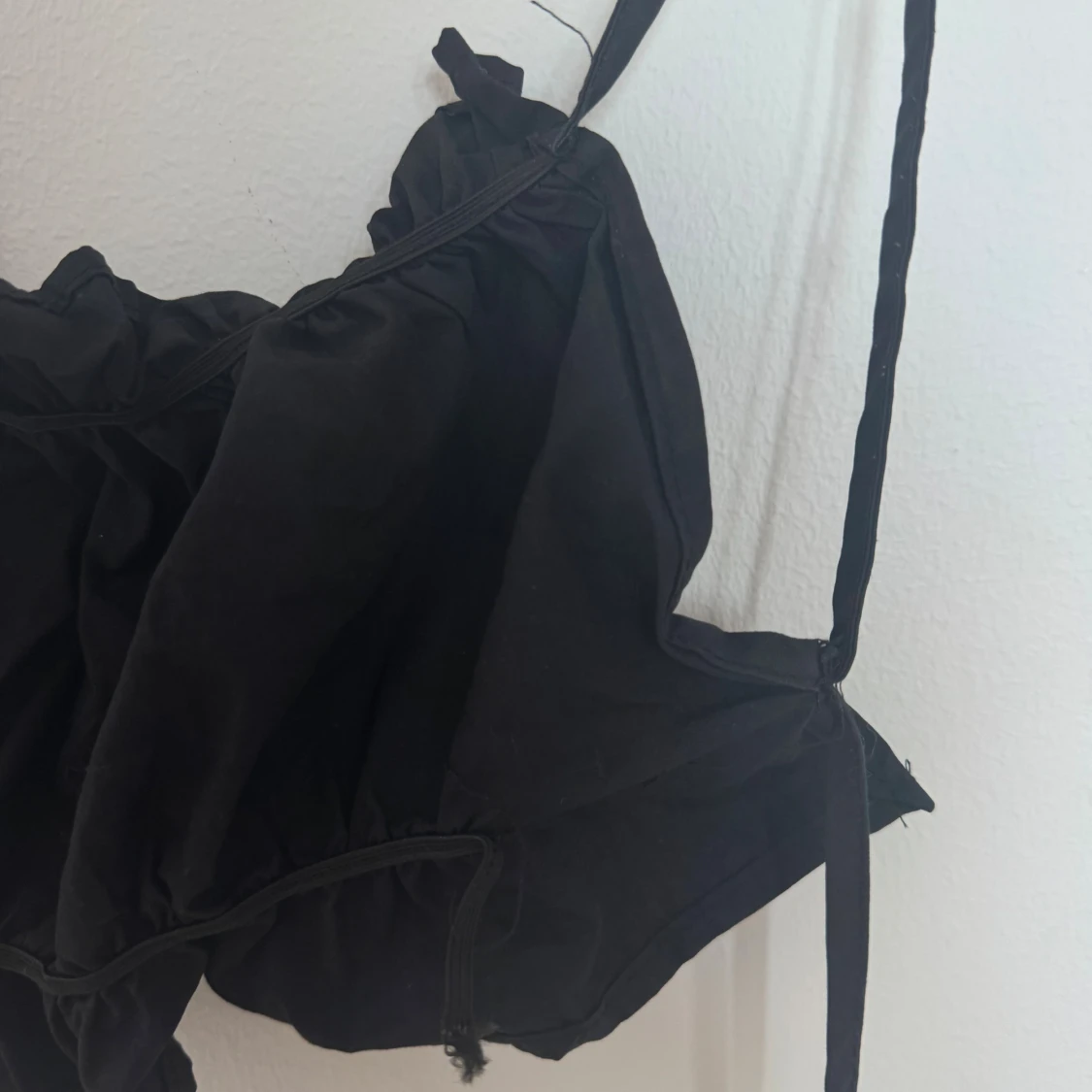 Supersöt svart linnetopp / fest topp med volangdetaljer och tunna axelband som knyts. Toppen är croppad och har en luftig, rynkad design. Helt bar i ryggen där man knyter. Lite sönder på insidan, inget som påverkar dock