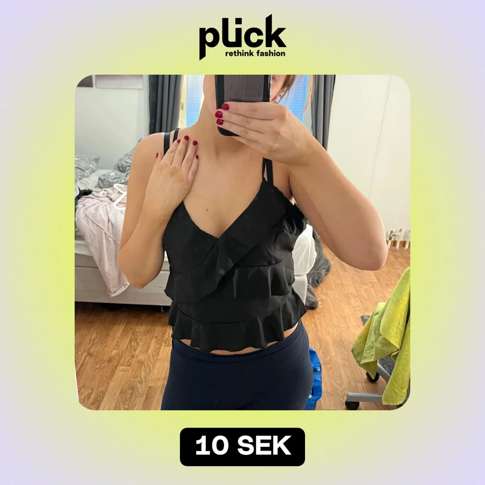 Säljer ett snyggt svart linne med volanger. Perfekt för festliga tillfällen! Linnet har smala axelband och en v-ringad design som ger en elegant look. Passar bra till både jeans och kjol.