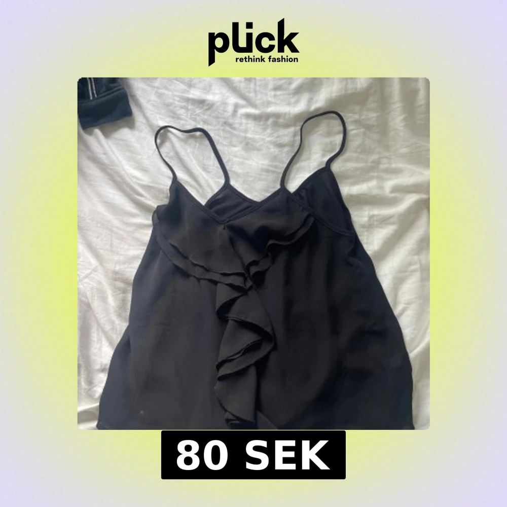 Svart linnetopp från BikBok med tunna axelband och snygga volangdetaljer framtill. Toppen har en v-ringad skärning och är perfekt för dig som gillar en stilren men ändå lekfull look. Materialet känns lätt och luftigt.