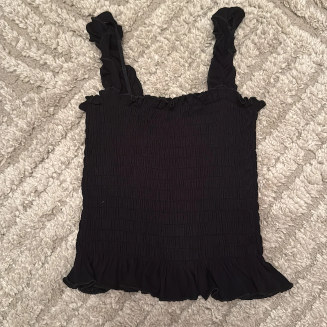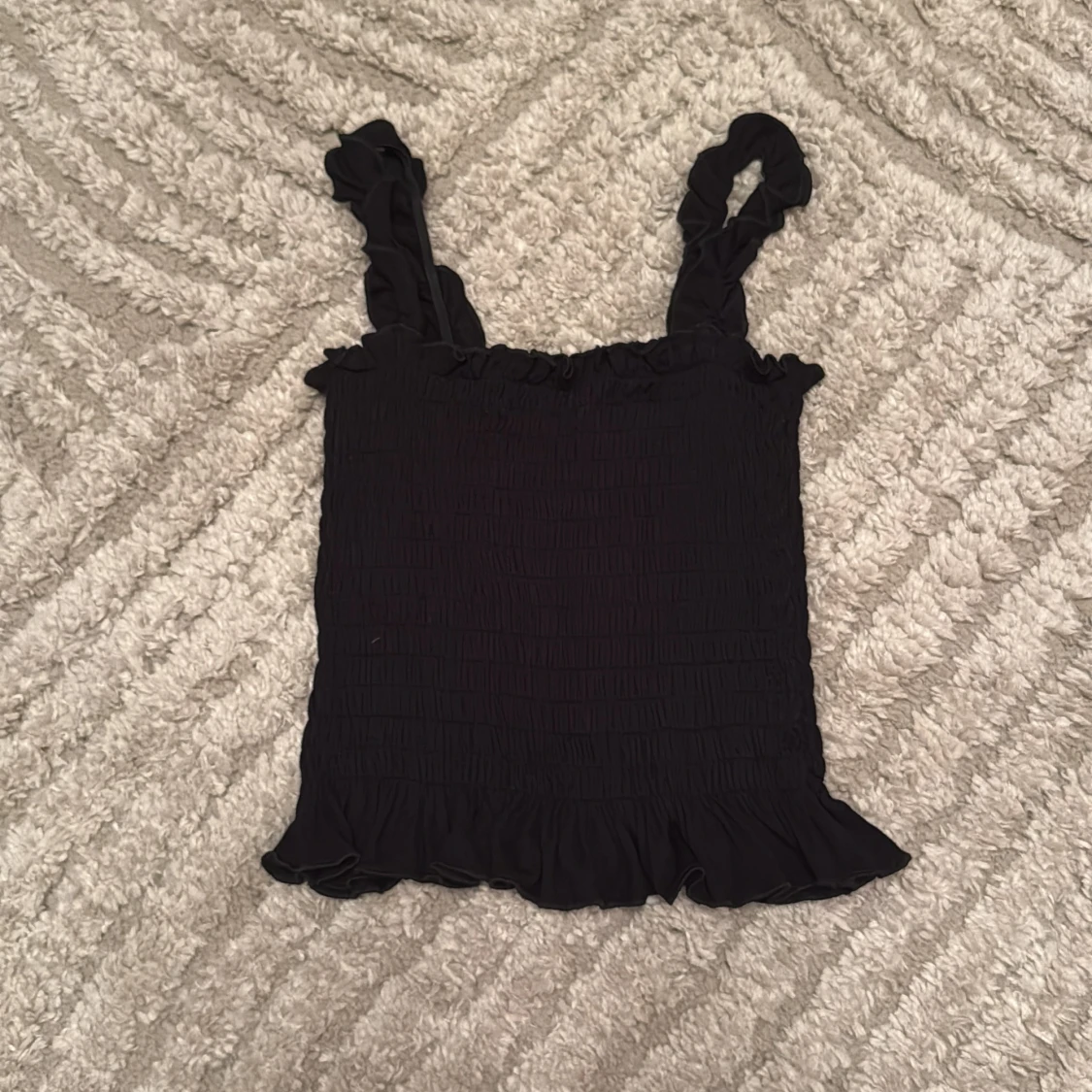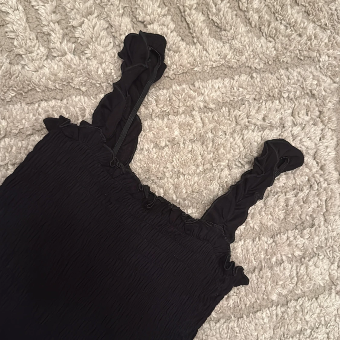 Supersöt svart topp från Boohoo med smockad kropp och breda axelband med volangdetaljer. Toppen har även volangkant nertill för en extra feminin touch. Perfekt att styla med jeans eller kjol för en trendig look.