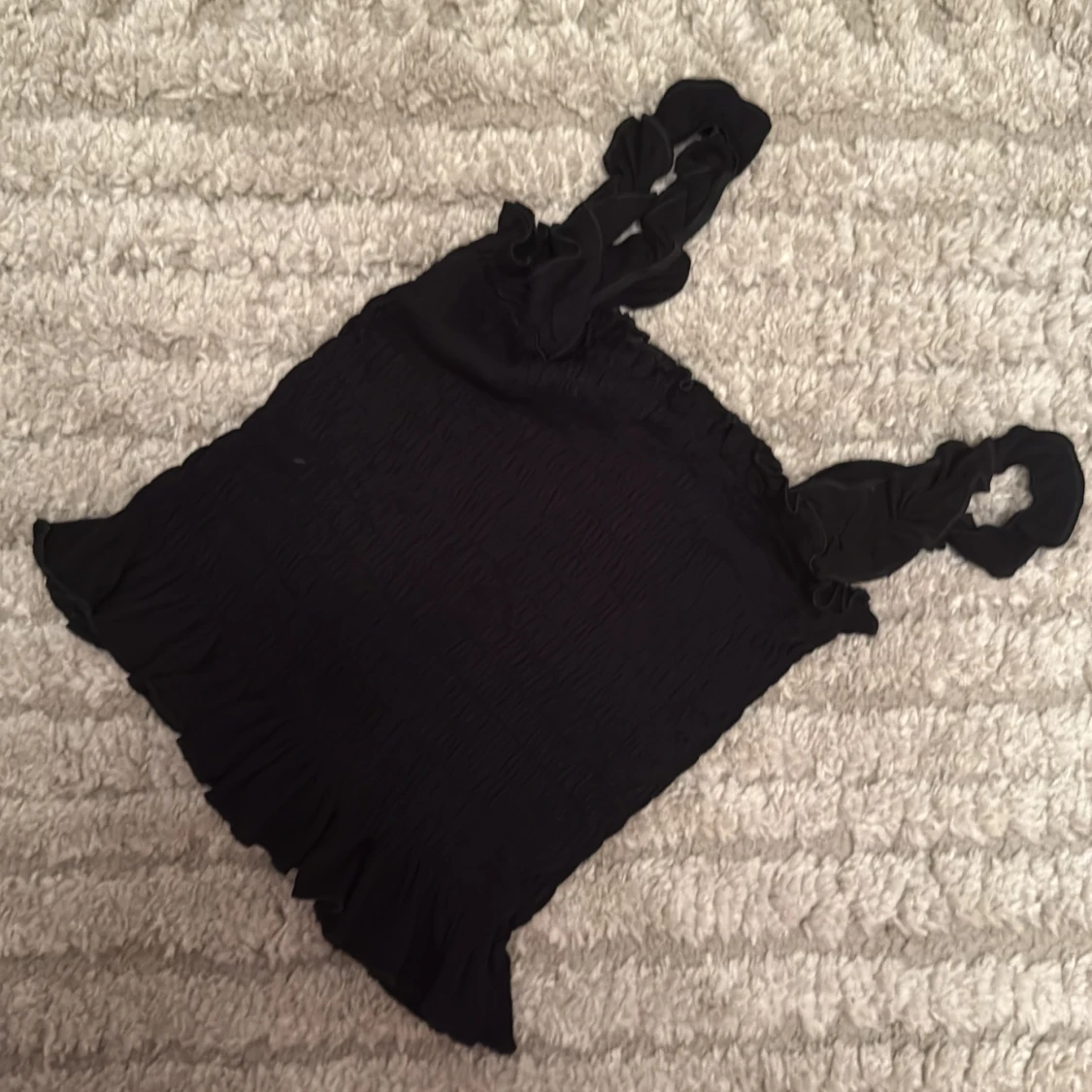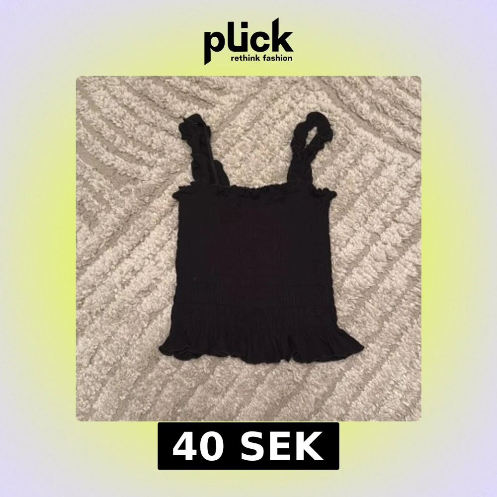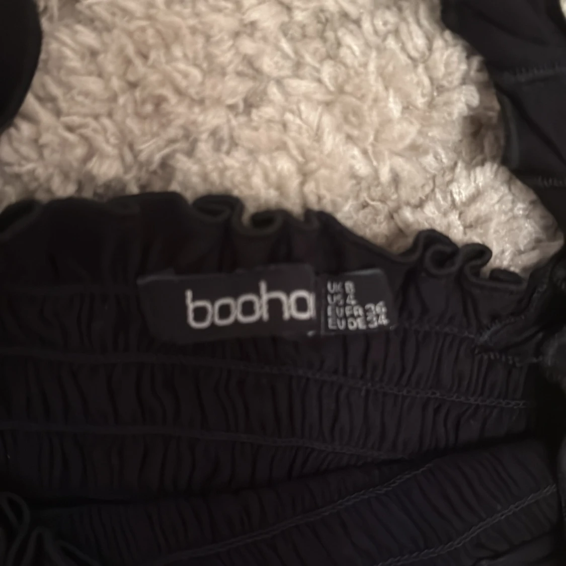 Supersöt svart topp från Boohoo med smockad kropp och breda axelband med volangdetaljer. Toppen har även volangkant nertill för en extra feminin touch. Perfekt att styla med jeans eller kjol för en trendig look.