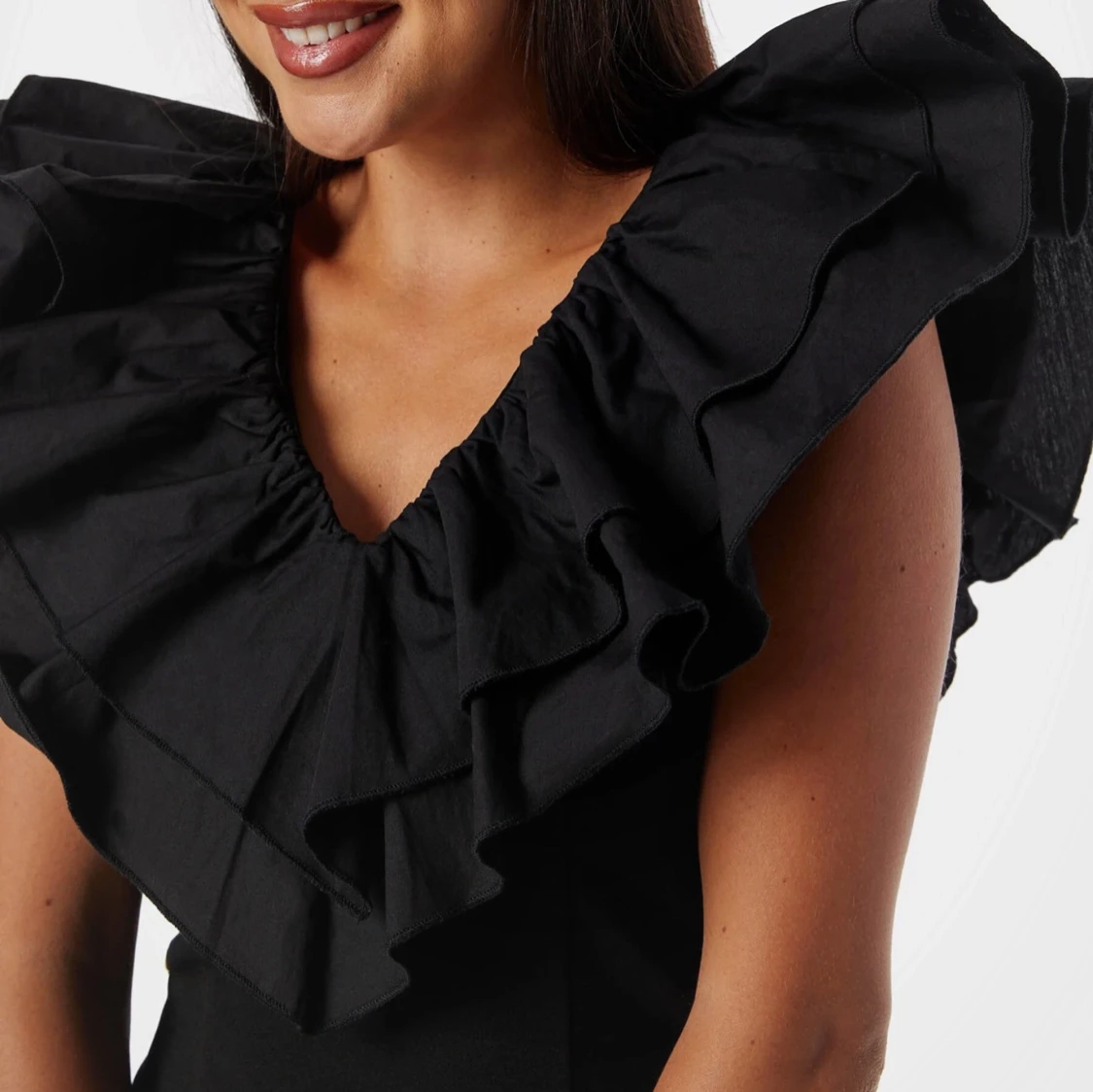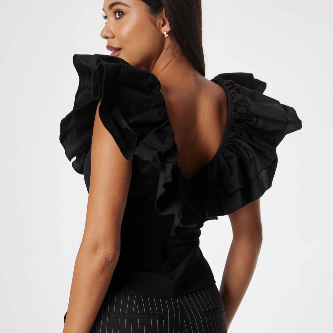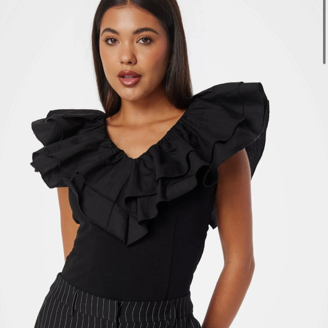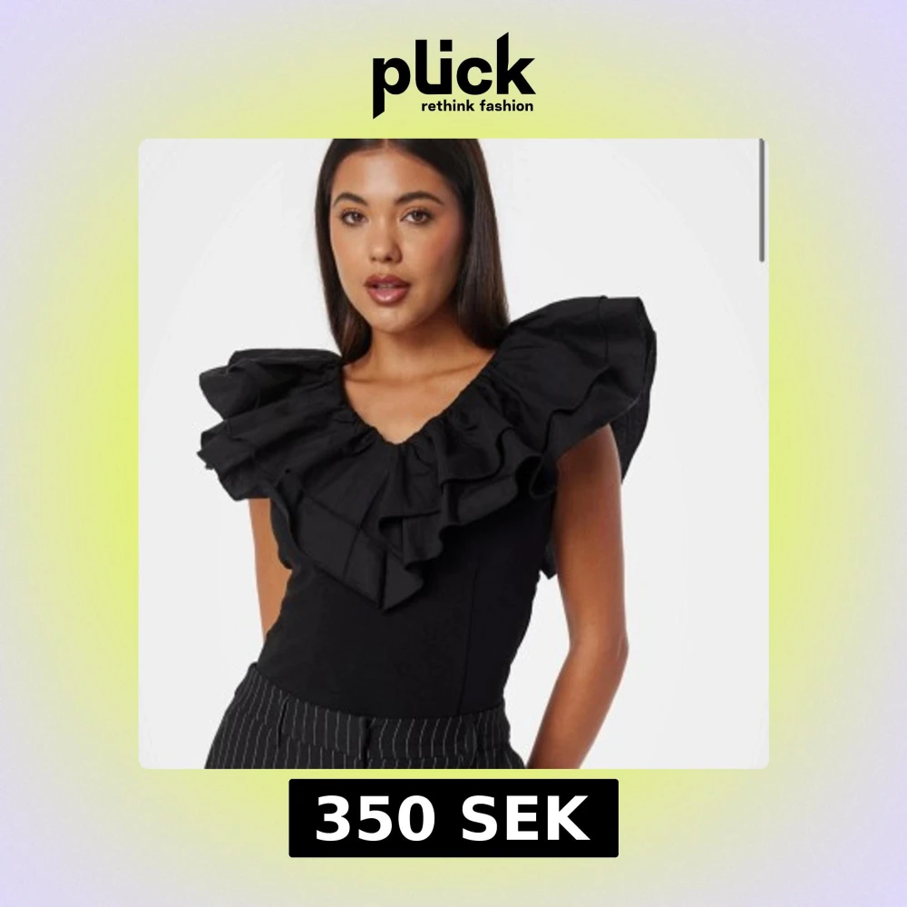 Snygg svart topp med volanger runt halsen och axlarna. Den är använd en gång bara och är från bubbleroom