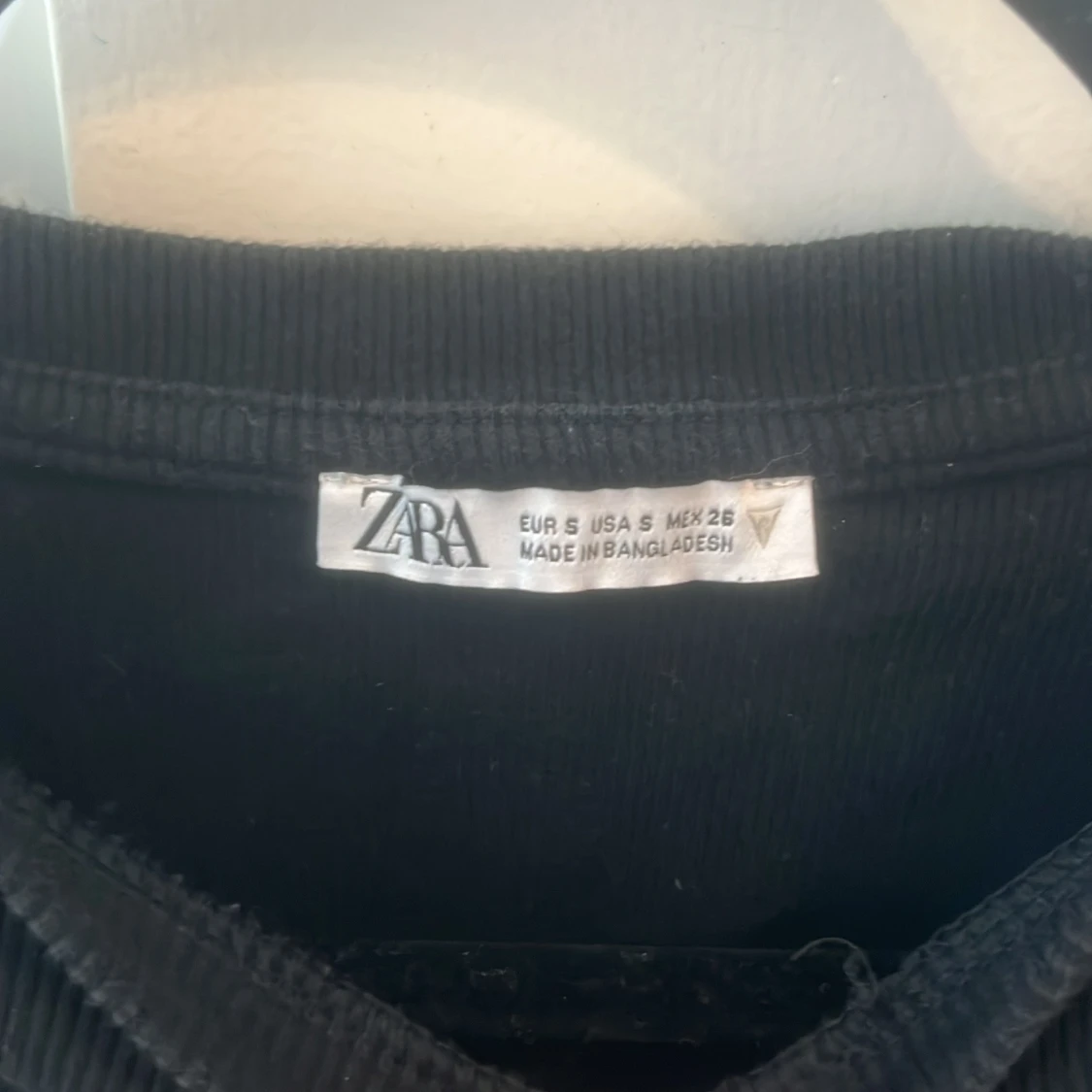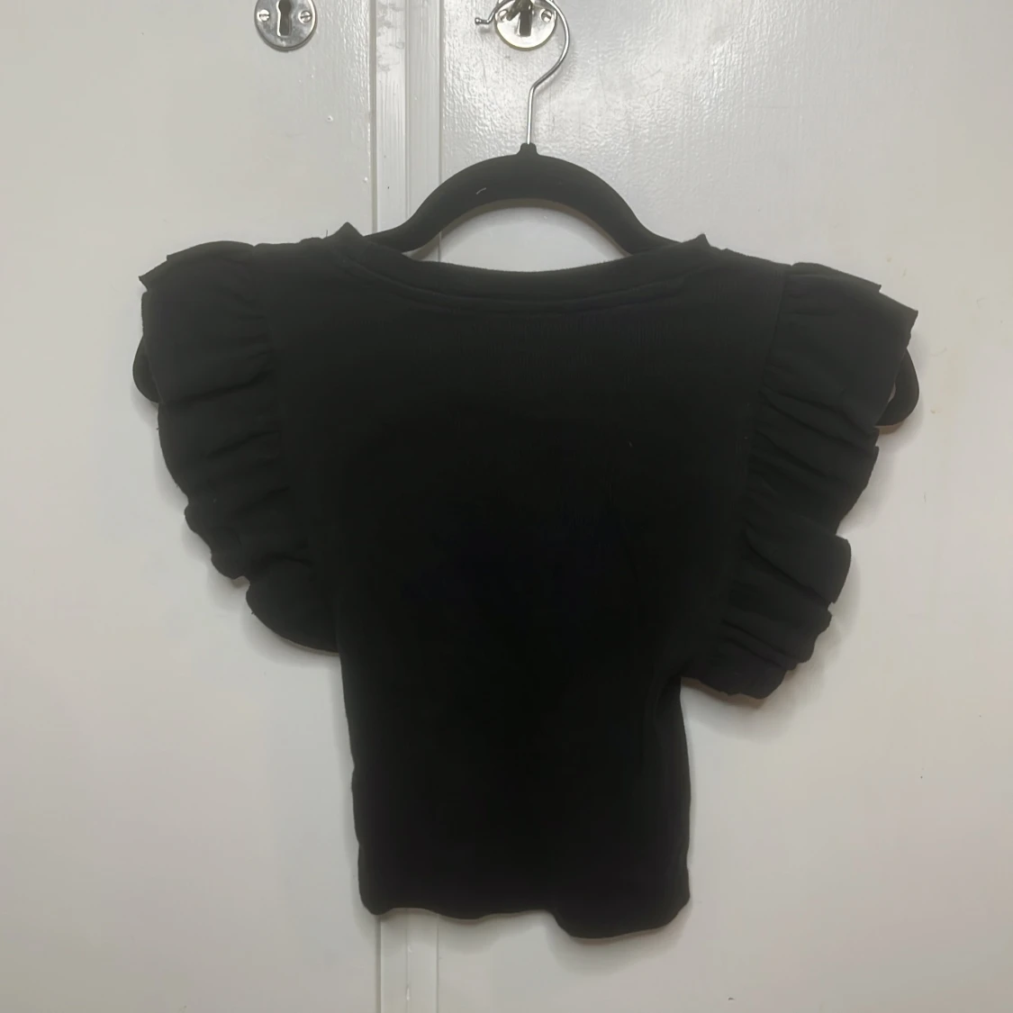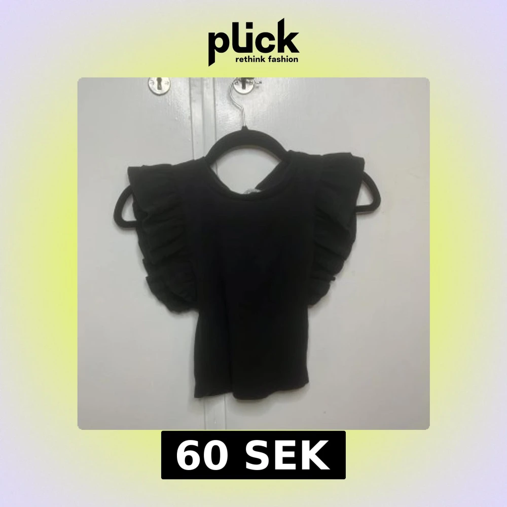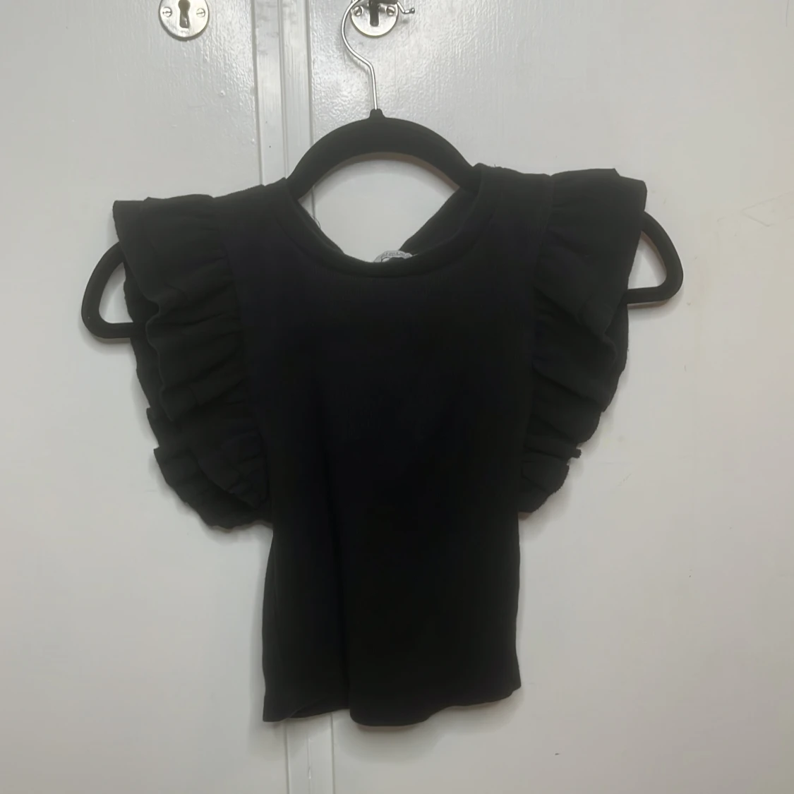 Supersnygg svart topp från Zara med breda volangärmar. Toppen är ribbad och har en tight passform som framhäver figuren. Går att använda på vardagen men också inför event.