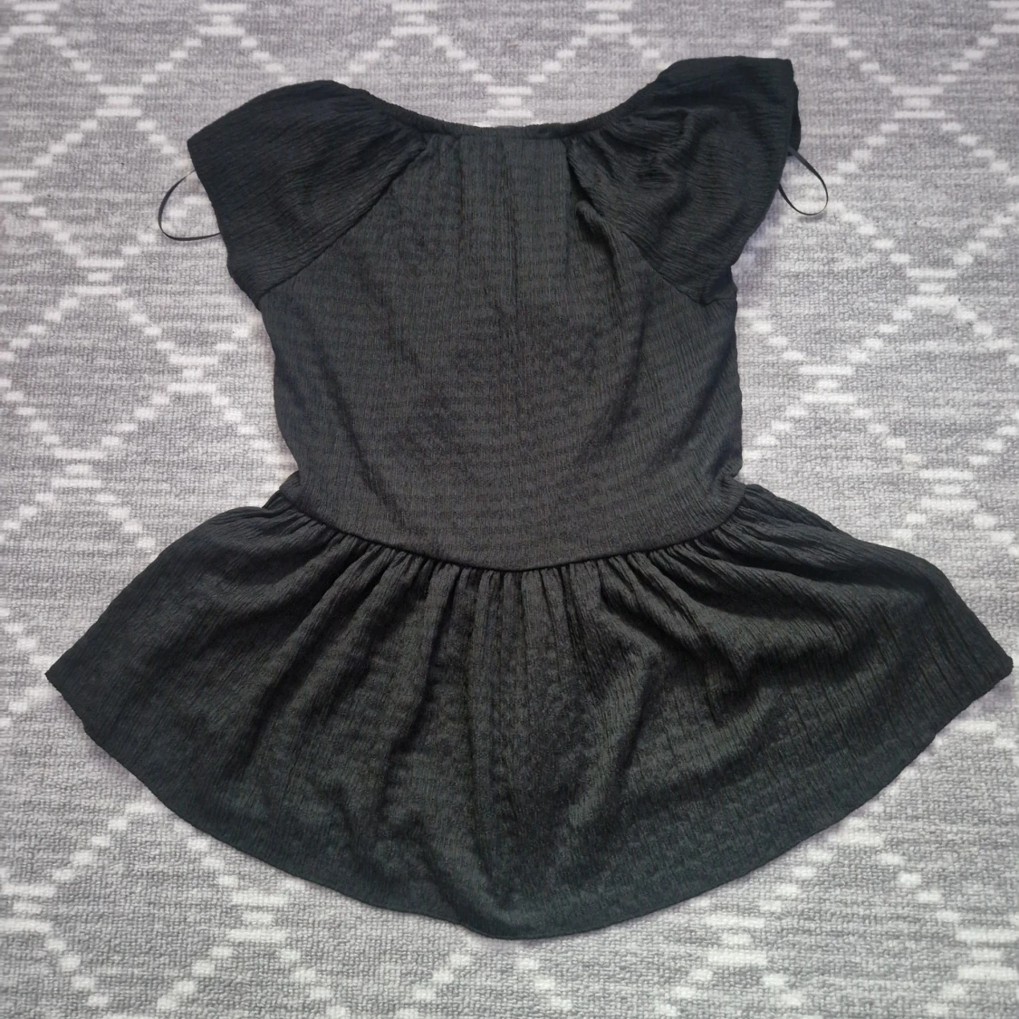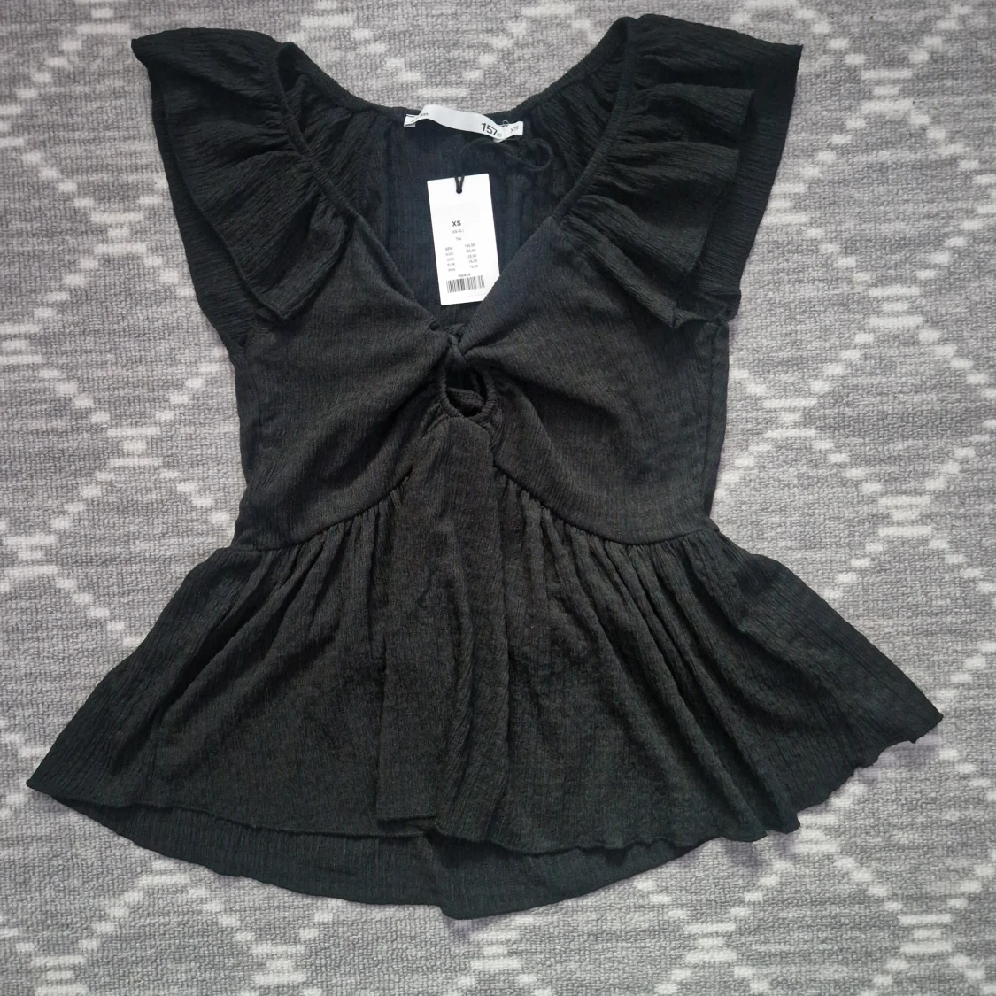 Säljer en svart topp med v-ringning och volangdetaljer vid axlarna. Toppen har en lätt rynkad effekt framtill och är sydd i ett mjukt, lätt material. Perfekt för dig som gillar feminina detaljer och en luftig känsla.